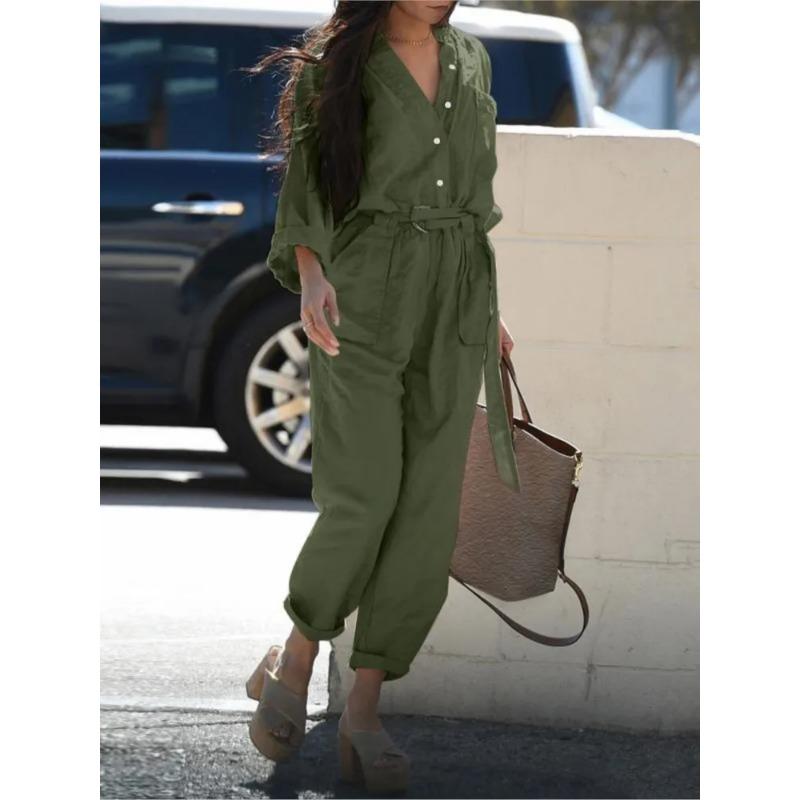 Осенний новый женский комбинезон из хлопка и льна, однотонный, с длинными рукавами, на пуговицах, с высокой талией, на шнуровке, повседневный, винтажный, женский комбинезон