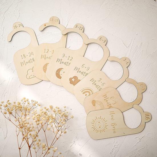 Представляем наши экологически чистые разделители размеров детской одежды для шкафа, изготовленные из прочных деревянных досок, что гарантирует их долговечность.. Эти органайзеры для детской одежды разработаны таким образом, чтобы их было легко увидеть в шкафу вашего ребенка, занимая при этом минимум места.. Благодаря 8/7 различным уровням вы можете без труда организовать одежду по месяцам по мере роста вашего ребенка от рождения до 24 месяцев.. Попрощайтесь с необходимостью рыться в кипах детской одежды с этими удобными разделителями для шкафа. Они не только поддерживают порядок, но и добавляют нотку элегантности в детскую комнату, делая вашу повседневную рутину более гладкой.. Просто повесьте их на вешалки для детской одежды, чтобы быстро организовать ее.