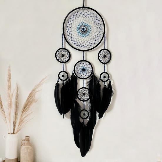 Символическое значение: Этот ловец снов, символизирующий захват прекрасных снов и отпугивающий кошмары, включает в себя символ сглаза для защиты и удачи.. Почувствуйте мир и благословение с этим значимым настенным декором.