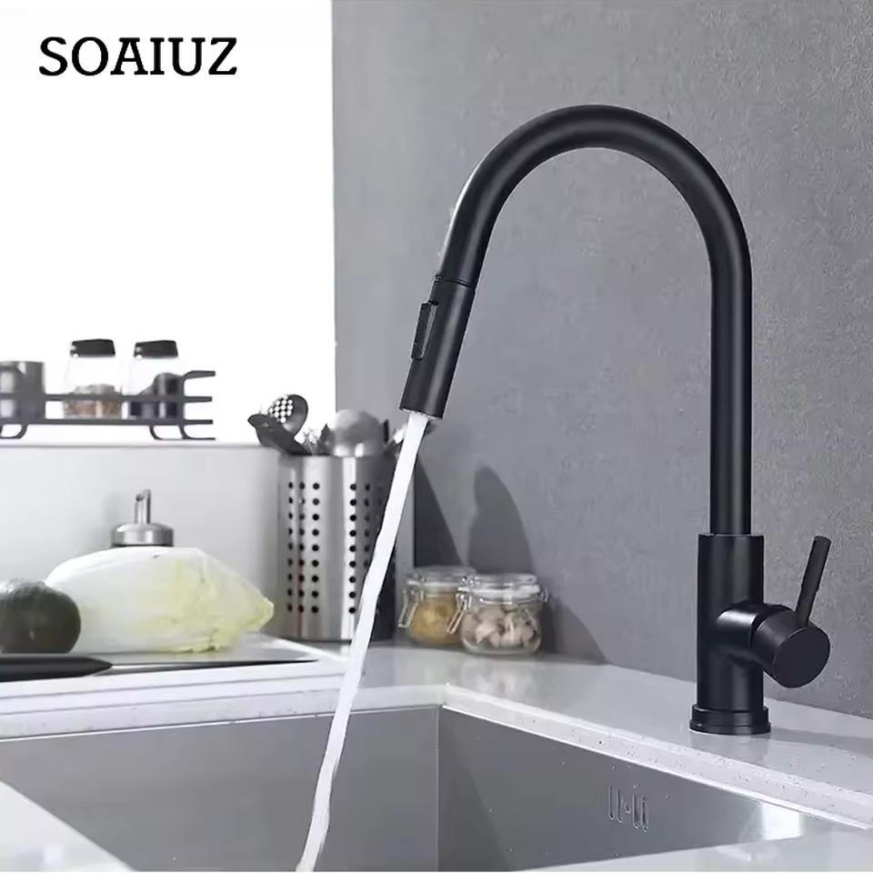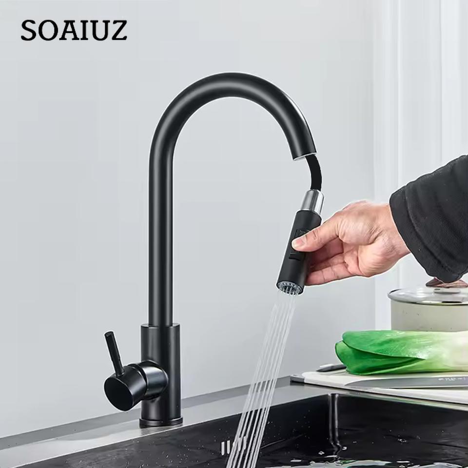 Черный кухонный кран с гибкой выдвижной насадкой, 2-режимный смеситель для холодной и горячей воды, смеситель из нержавеющей стали