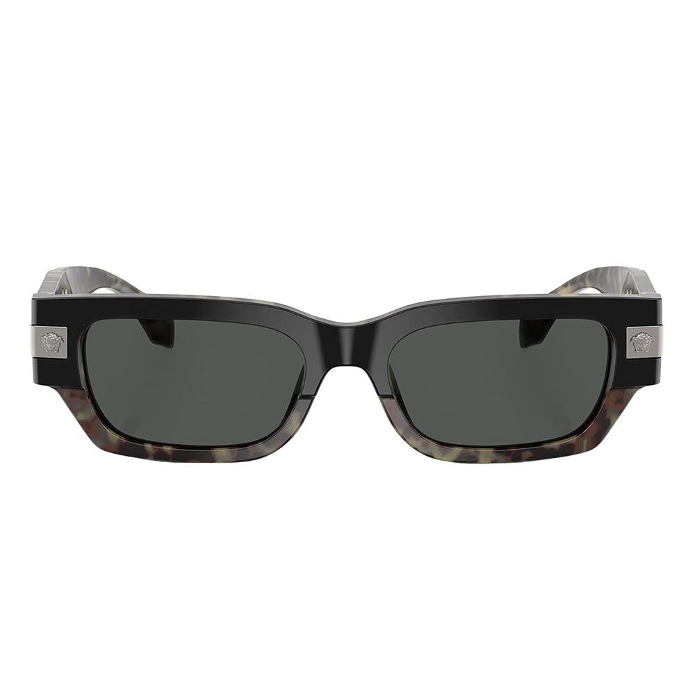 The Versace VE 4465 545687 is a unisex rectangular sunglasses design. The frame color is Havana, and the lens is grey. The frame material is plastic, and it features UV protection. This product includes a Versace case, cleaning cloth, and paperwork (actual contents may vary from the picture).