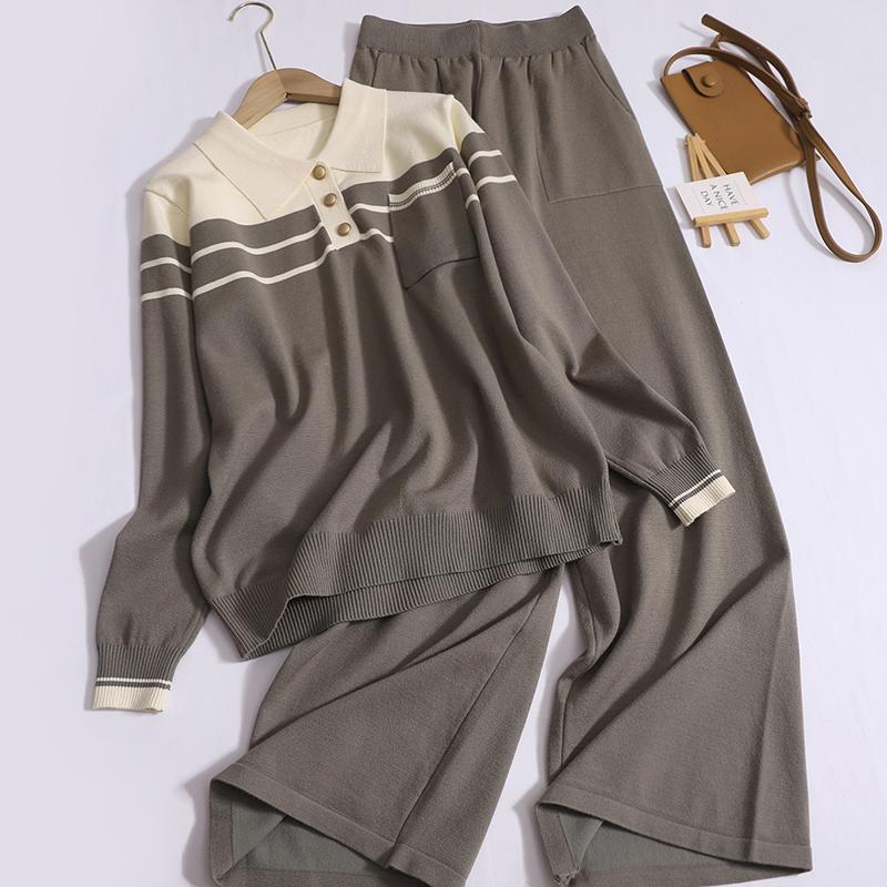 Женский повседневный осенний комплект из двух предметов, свободный контрастный цвет, отложной воротник, длинный рукав, широкие брюки с карманами, трикотажный костюм — купить товар онлайн с бесплатной доставкой по всему миру!