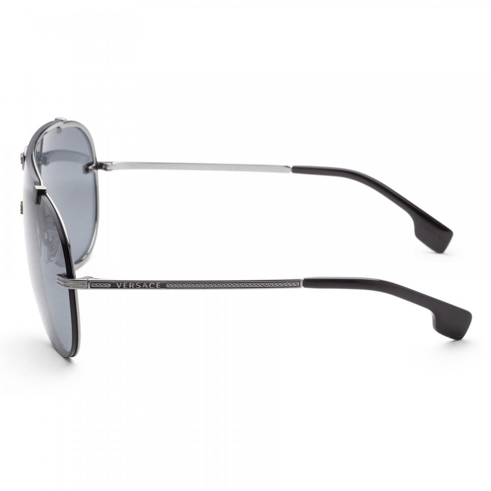 The Versace men's sunglasses feature a lens width of 43mm, a bridge width of 1mm, and arm length of 140mm. The frame is aviator-shaped made of gunmetal metal. The lenses are non-polarized grey mirror black. Made in Italy (VE2243-10016G).
