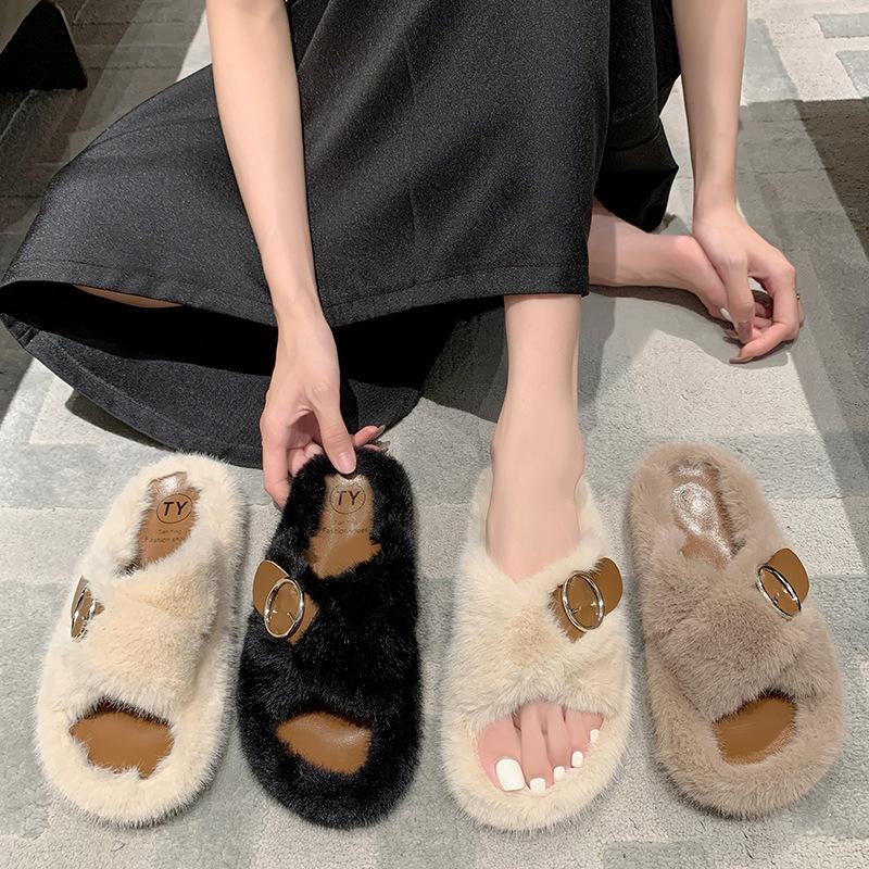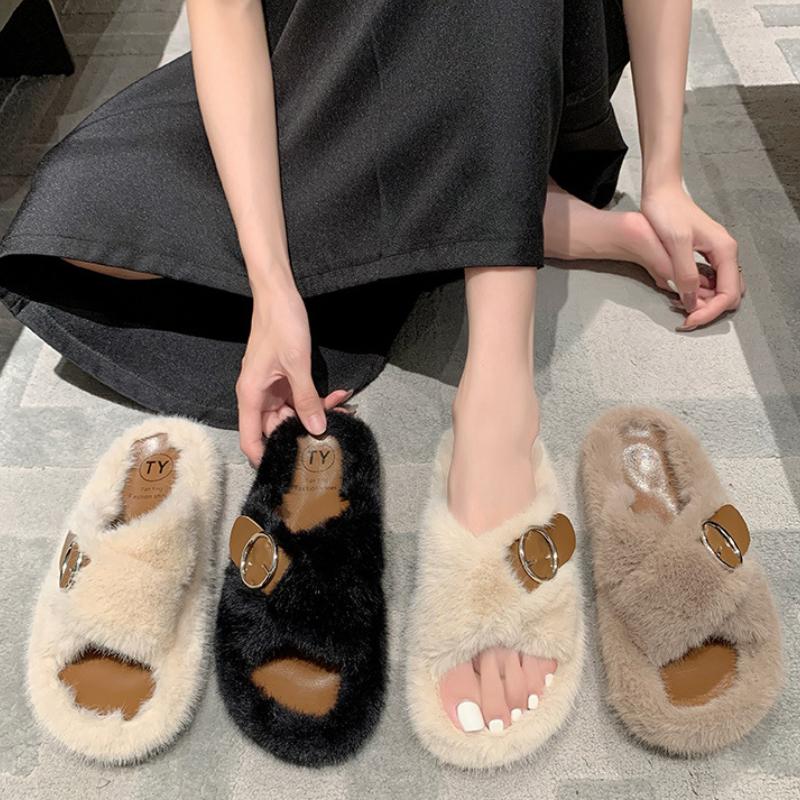 Модные теплые пушистые тапочки женские плюшевые тапочки удобные пряжки на поясе искусственный мех крест накрест домашние тапочки плоские мягкие меховые туфли