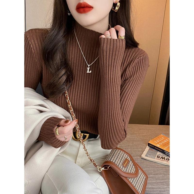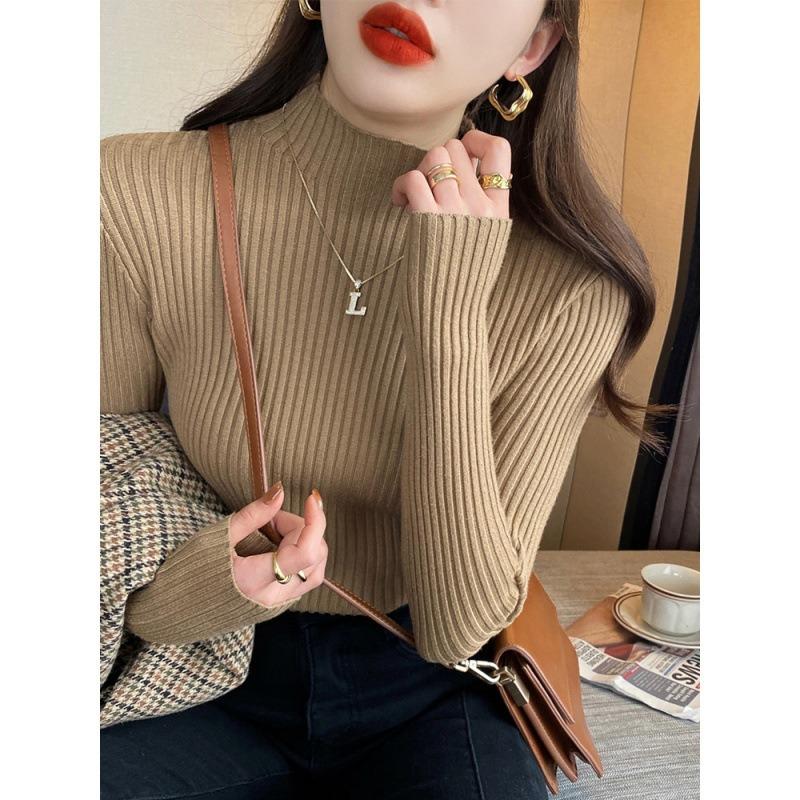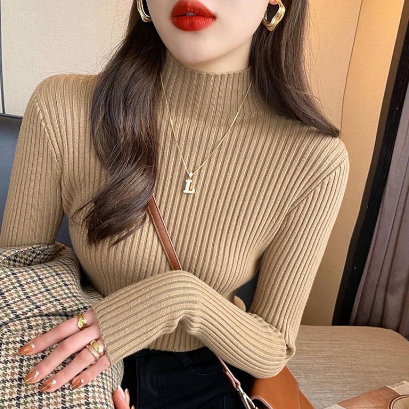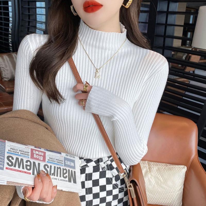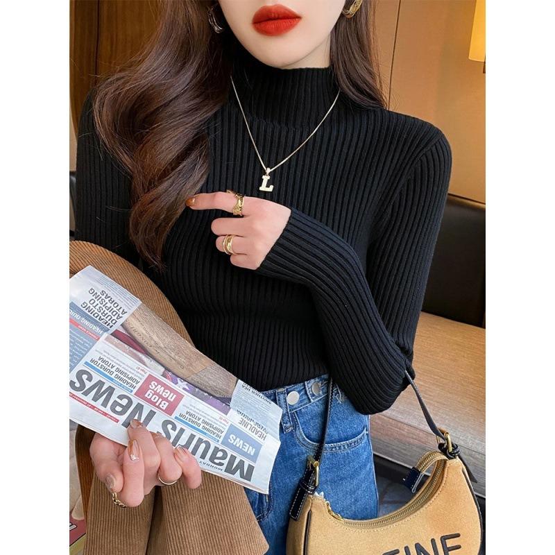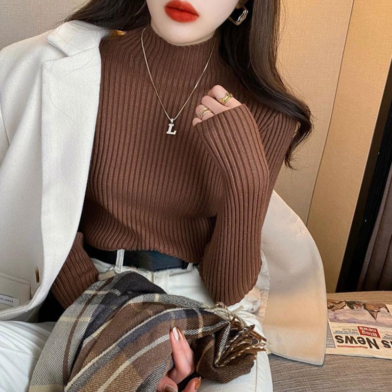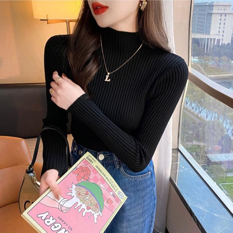 Осень-зима, длинный рукав, женский вязаный свитер, модный новый полувысокий воротник, базовый пуловер, свитера, топы, элегантный облегающий повседневный теплый трикотаж 25058