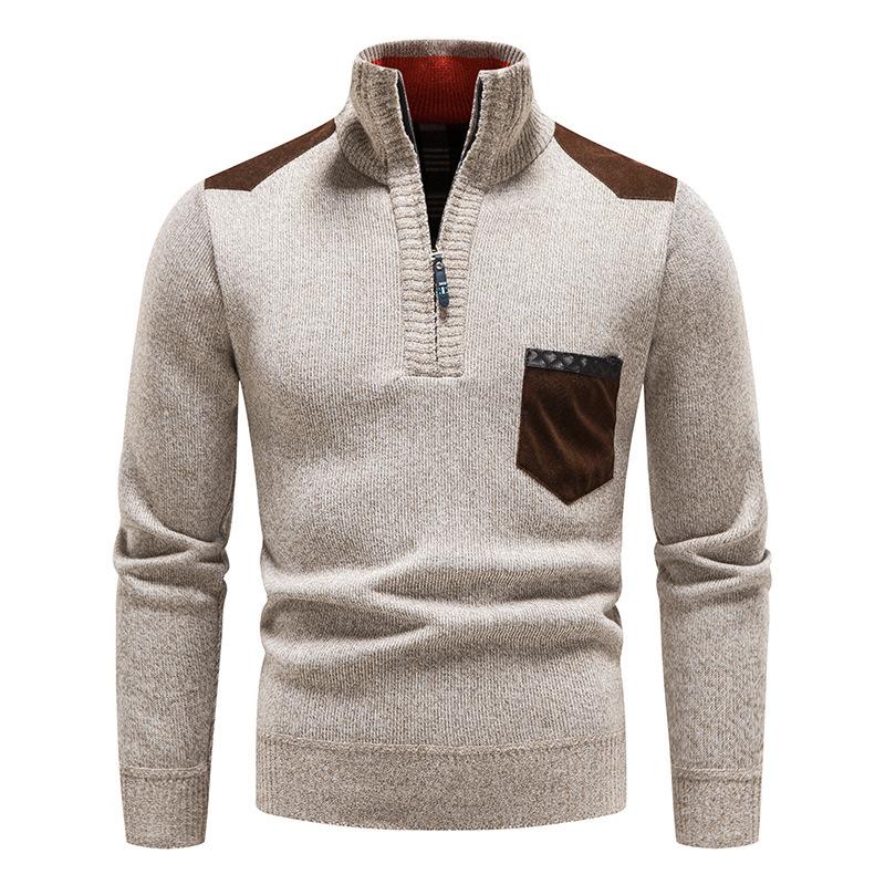 Зимний мужской свитер с воротником-стойкой, мужской трикотажный свитер в стиле пэчворк, облегающий коричневый вязаный свитер, мужской флисовый теплый пуловер