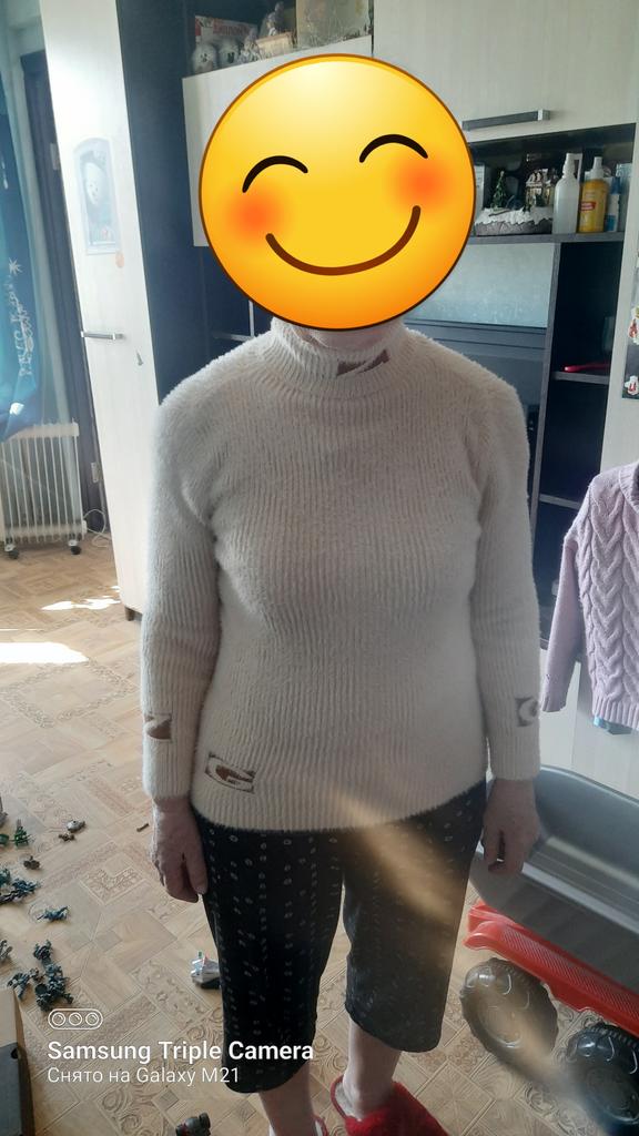 Пришла моя прелесть! Ждала долго. Свитер оооочень мягкий. Мой размер 48 - 50, мамин 48. И на мне и на ней сидит хорошо. Фото с мамой. Швы все ровные,аккуратные, рукав прям как раз по длинне. Воротник не давит. Запаха нет, что очень хорошо.