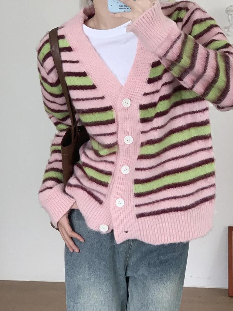 Женский милый однобортный полосатый кардиган, пальто, повседневный утолщенный теплый свитер с V-образным вырезом, осенне-зимняя термовязаная куртка — купить товар онлайн с бесплатной доставкой по всему миру!