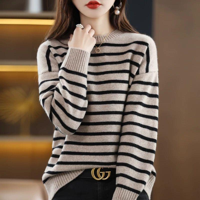Осенне-зимний полосатый свитер для женщин 2024 года, новая свободная короткая верхняя одежда с круглым вырезом, ленивый трикотажный верх, универсальная нижняя рубашка — купить товар онлайн с бесплатной доставкой по всему миру!