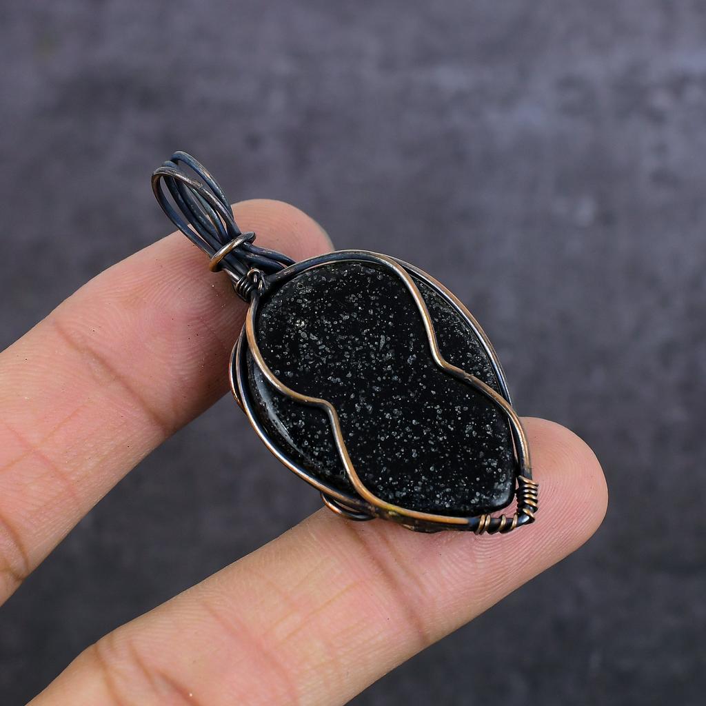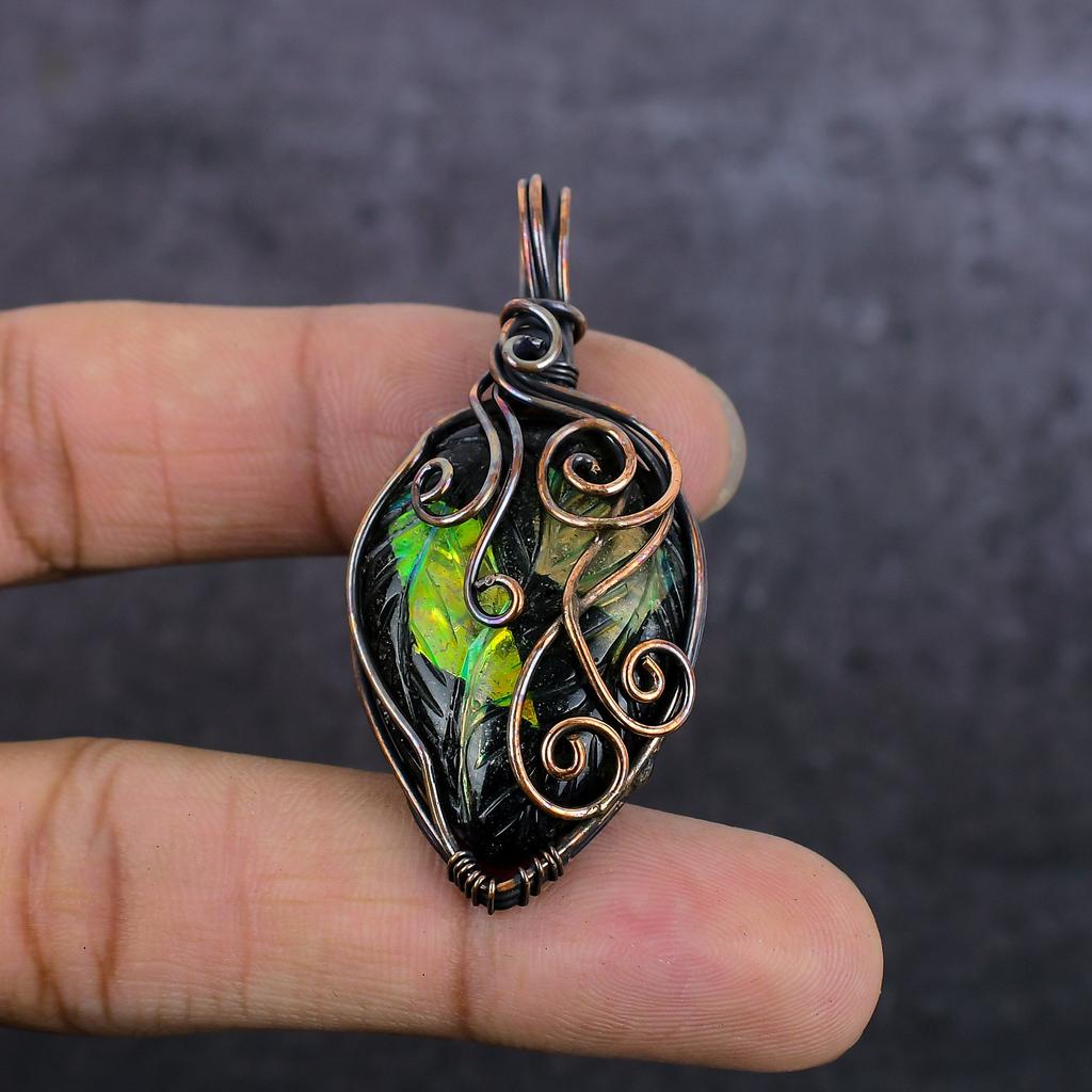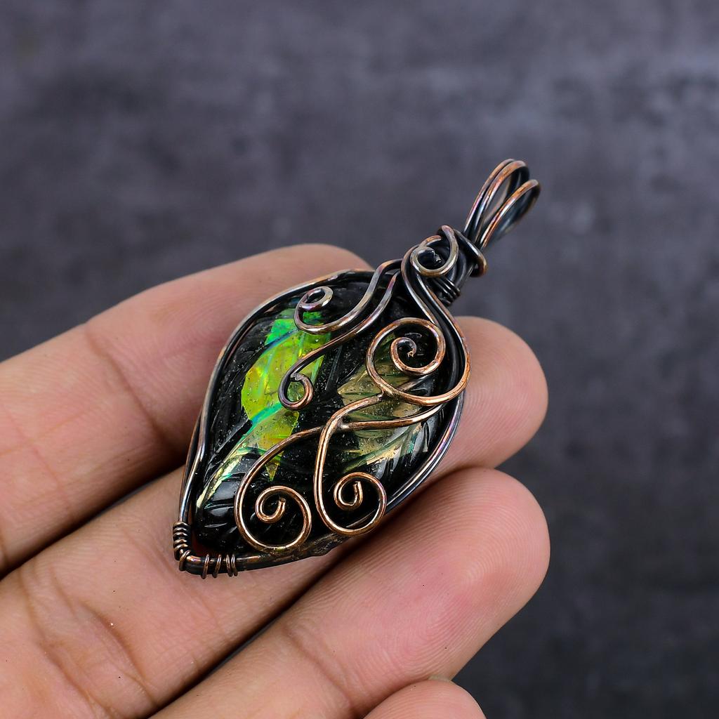 Дихроичный стеклянный драгоценный камень Ручная работа Медная проволока Ювелирный кулон 2.25" p2t61