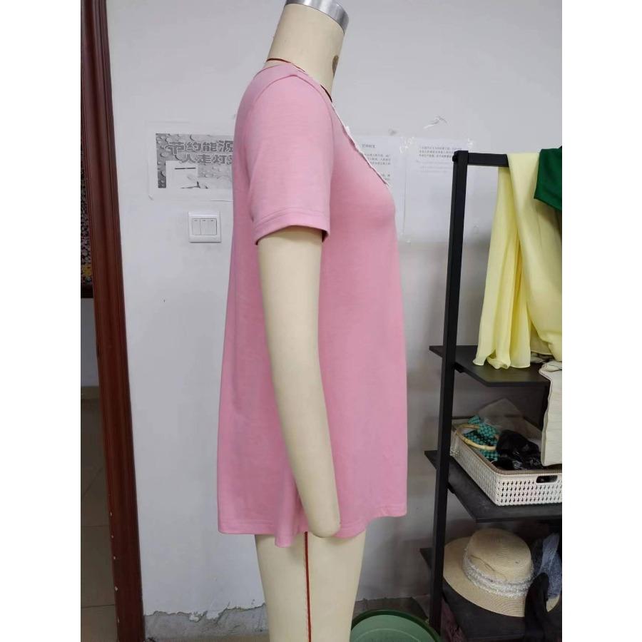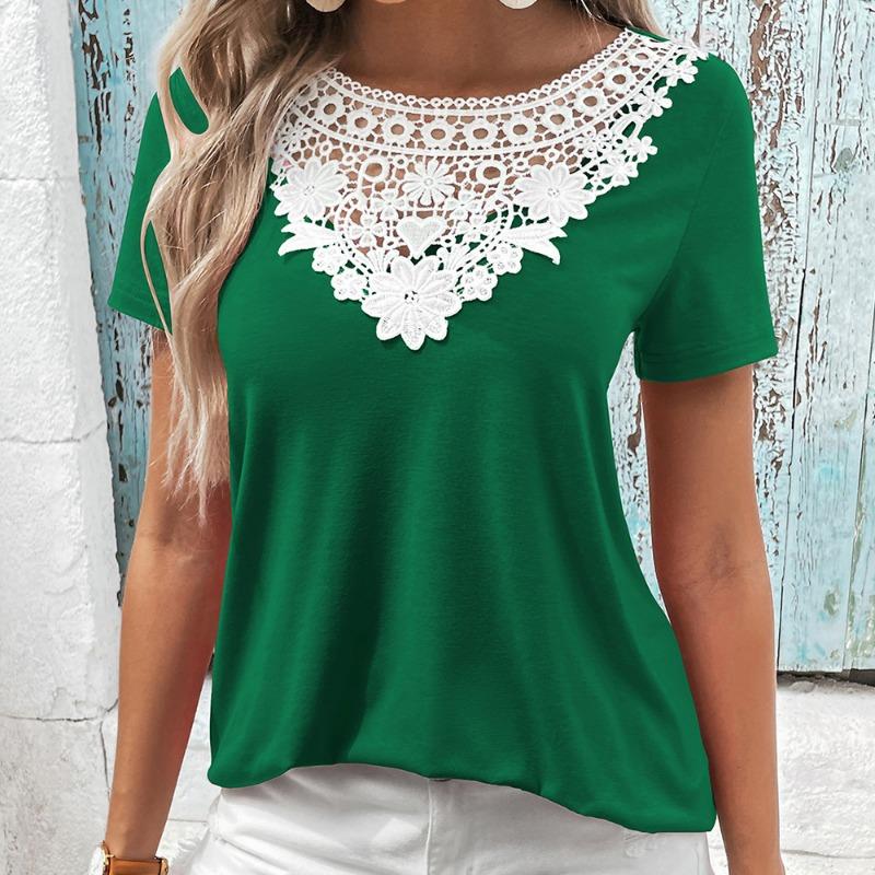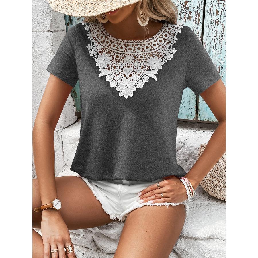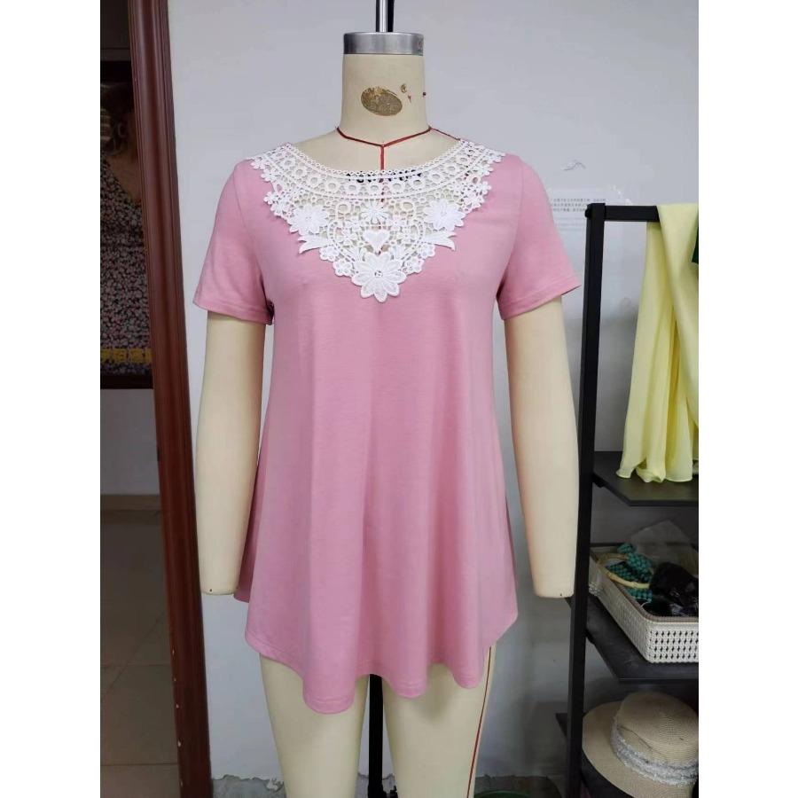 Женская повседневная свободная футболка с коротким рукавом и кружевным лоскутным воротником