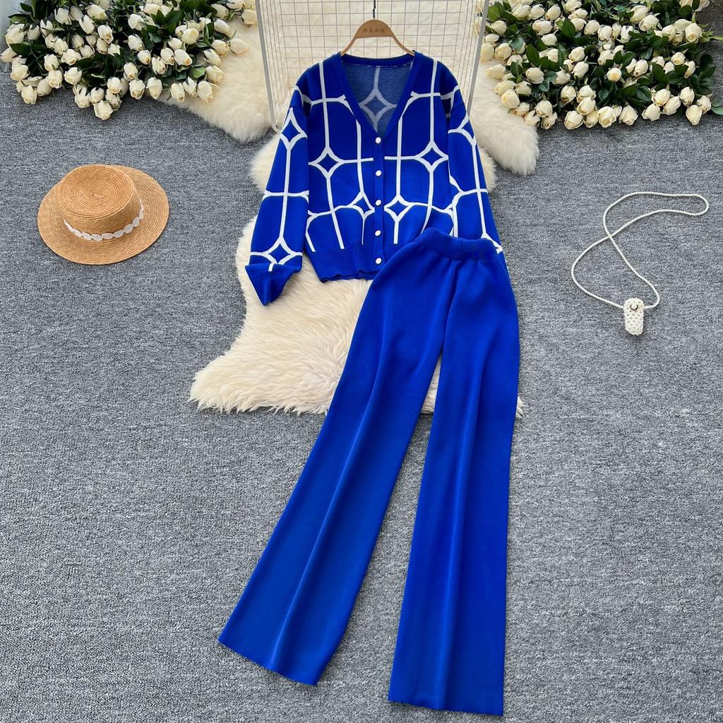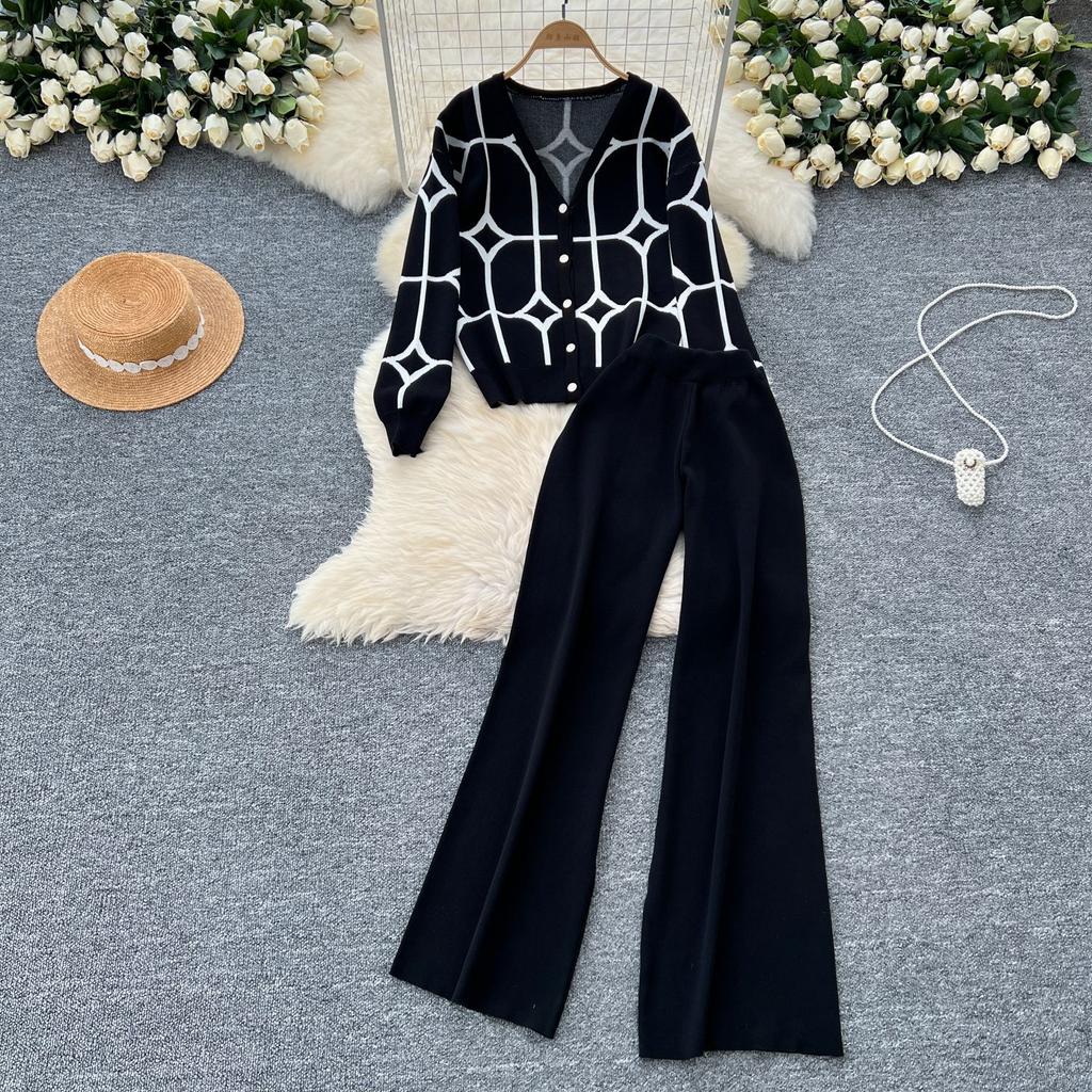 Женский свитер, кардиган, комплект брюк, повседневные костюмы, осень-зима, трикотажные свободные, с длинным рукавом, элегантные клетчатые топы, свитера, брюки