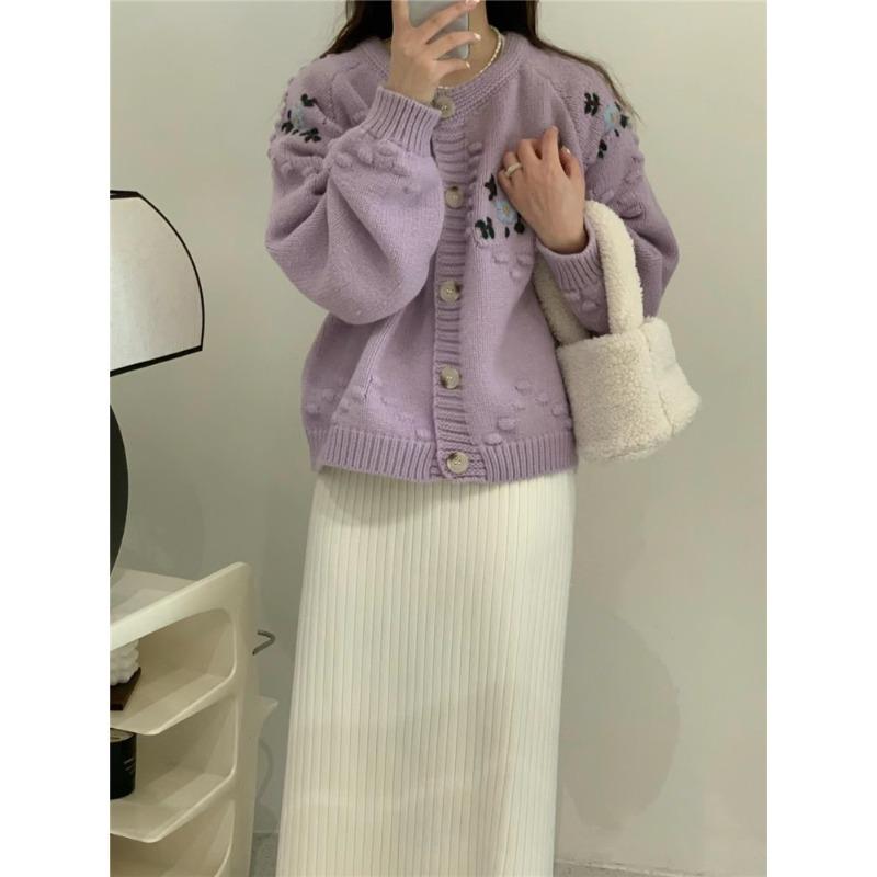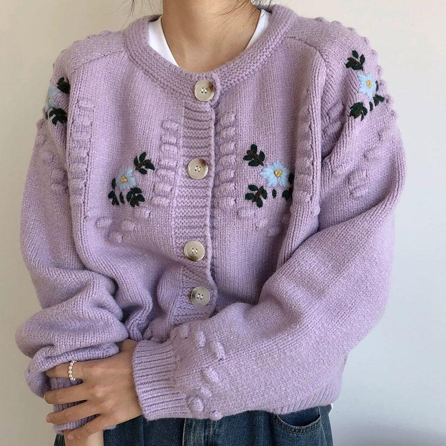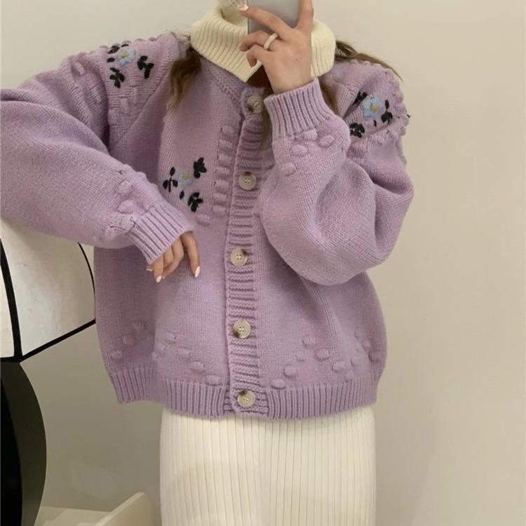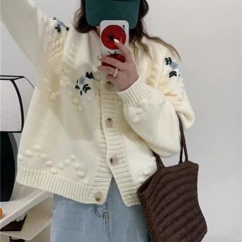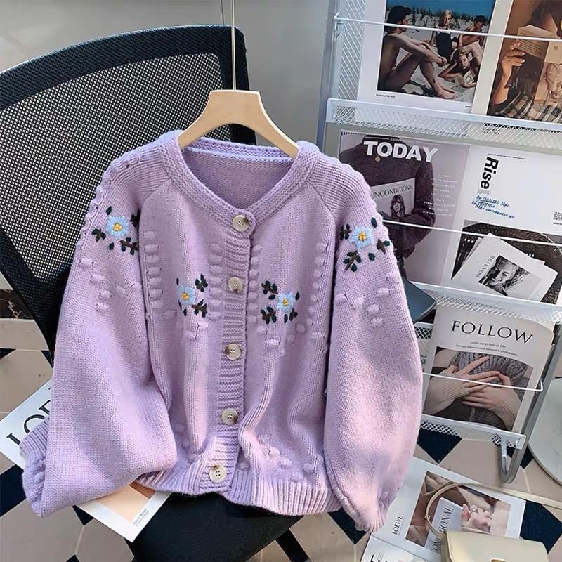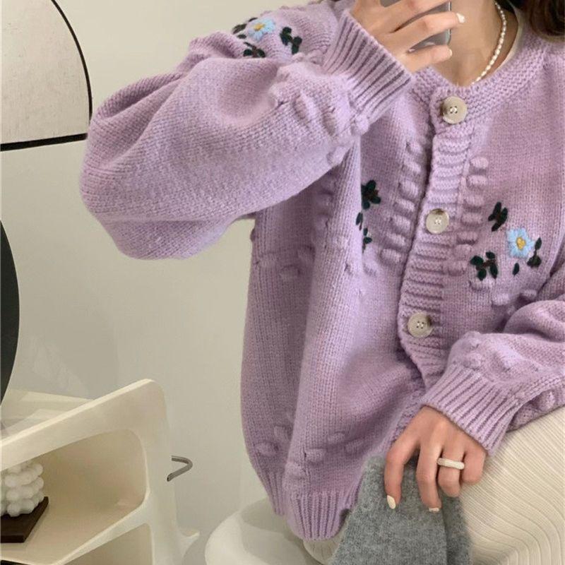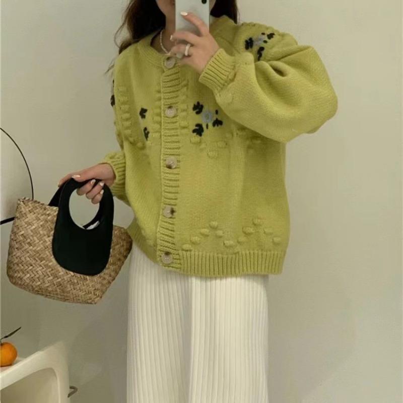 Осенне-зимний женский свитер, мягкий свободный утолщенный вязаный кардиган с круглым вырезом, толстый трикотаж, цветочный дизайн, куртка-свитер с чувством старения