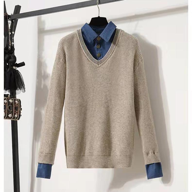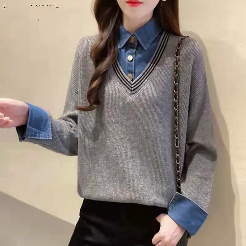Весенне-осенний женский лоскутный джинсовый свитер с воротником из двух частей, свободный пуловер, вязаный свитер, топ с длинными рукавами