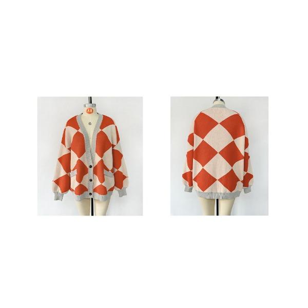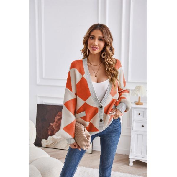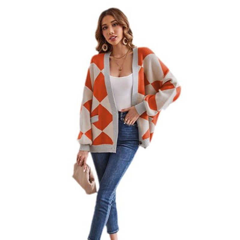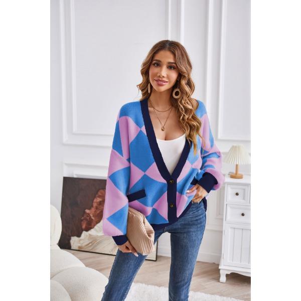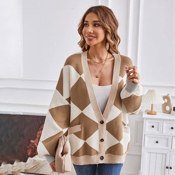 Зимний женский свитер, кардиган с v-образным вырезом, геометрический узор, контрастные цвета, вязаный кардиган, повседневная свободная куртка