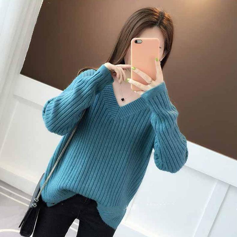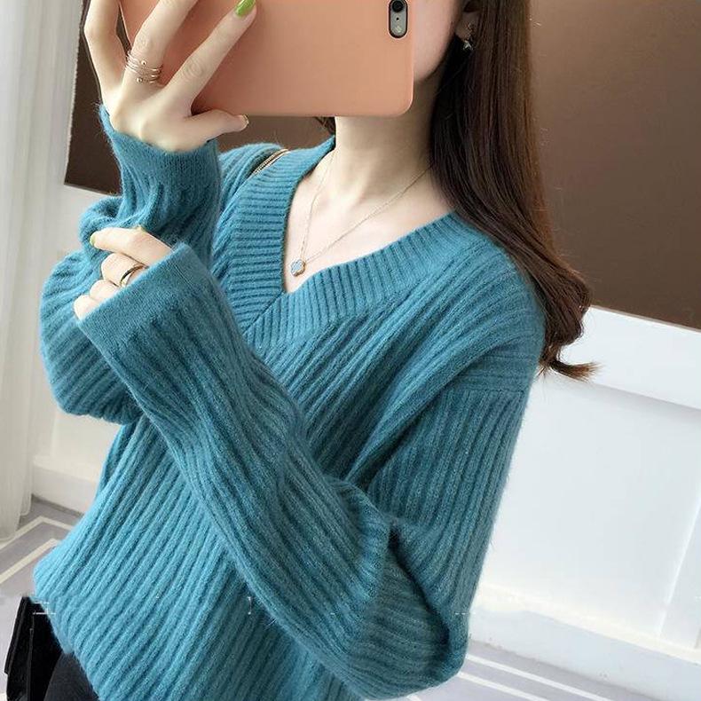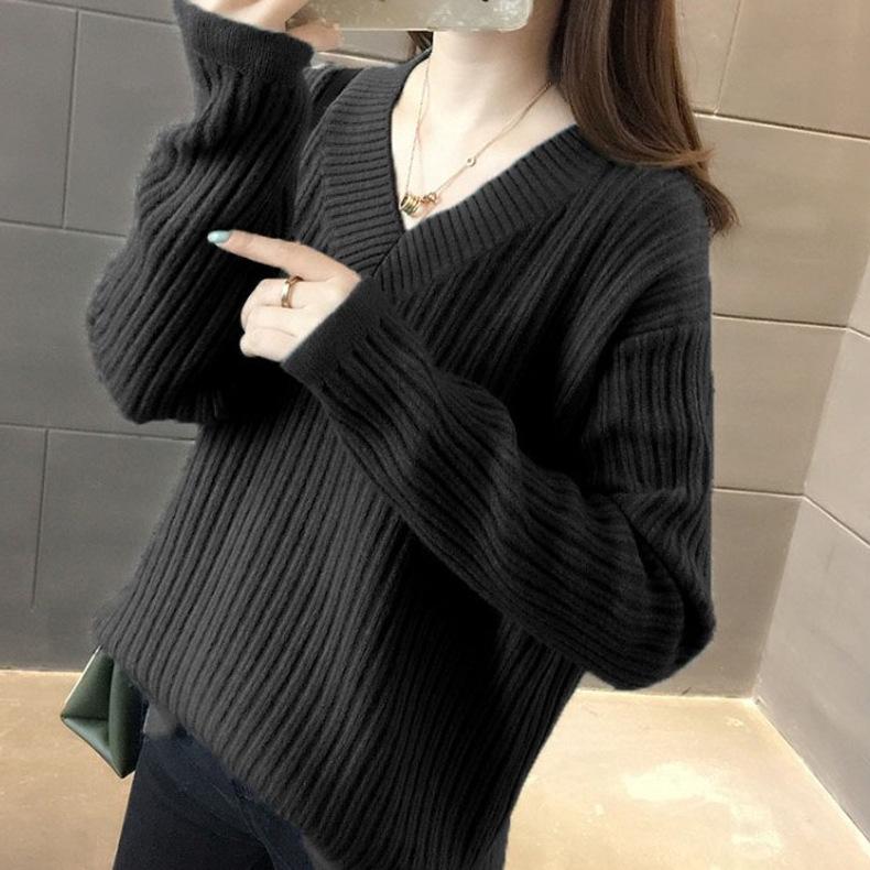 Осенне-зимний женский свитер, нижняя рубашка с v-образным вырезом, свободный вязаный свитер в полоску с длинными рукавами и ленивым ветром