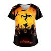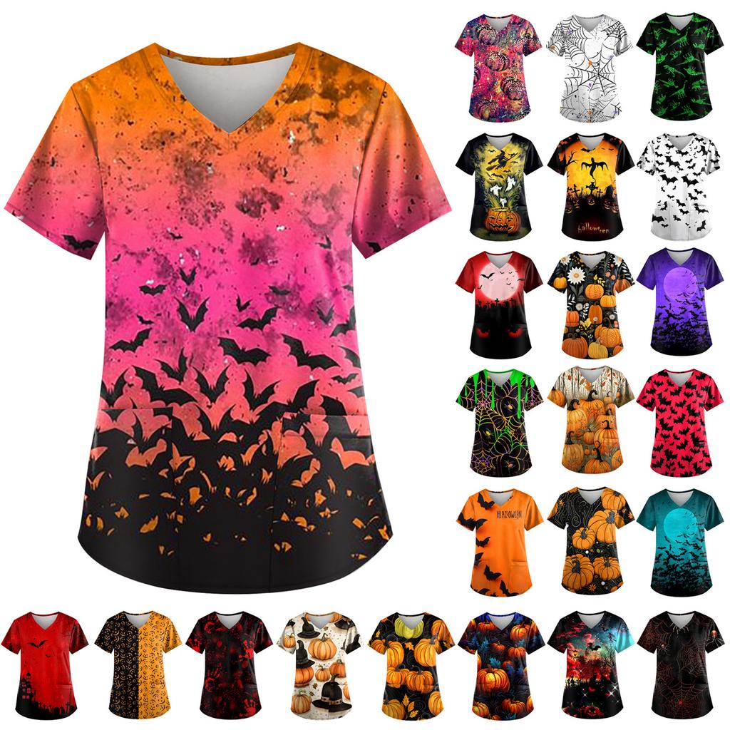 Плюс размер Хэллоуин печатная рабочая форма Топы для женщин футболки с v-образным вырезом и короткими рукавами рабочая одежда футболка с карманами