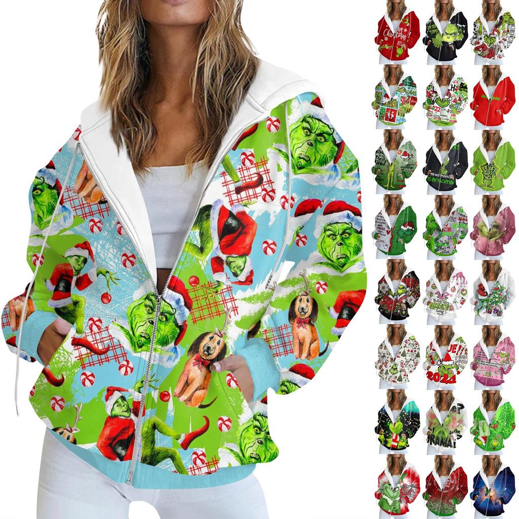Женская модная повседневная толстовка с рождественским принтом и длинными рукавами, карманная куртка, пальто с капюшоном на молнии — купить товар онлайн с бесплатной доставкой по всему миру!