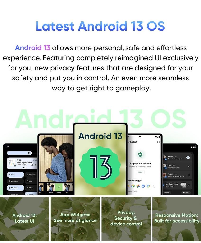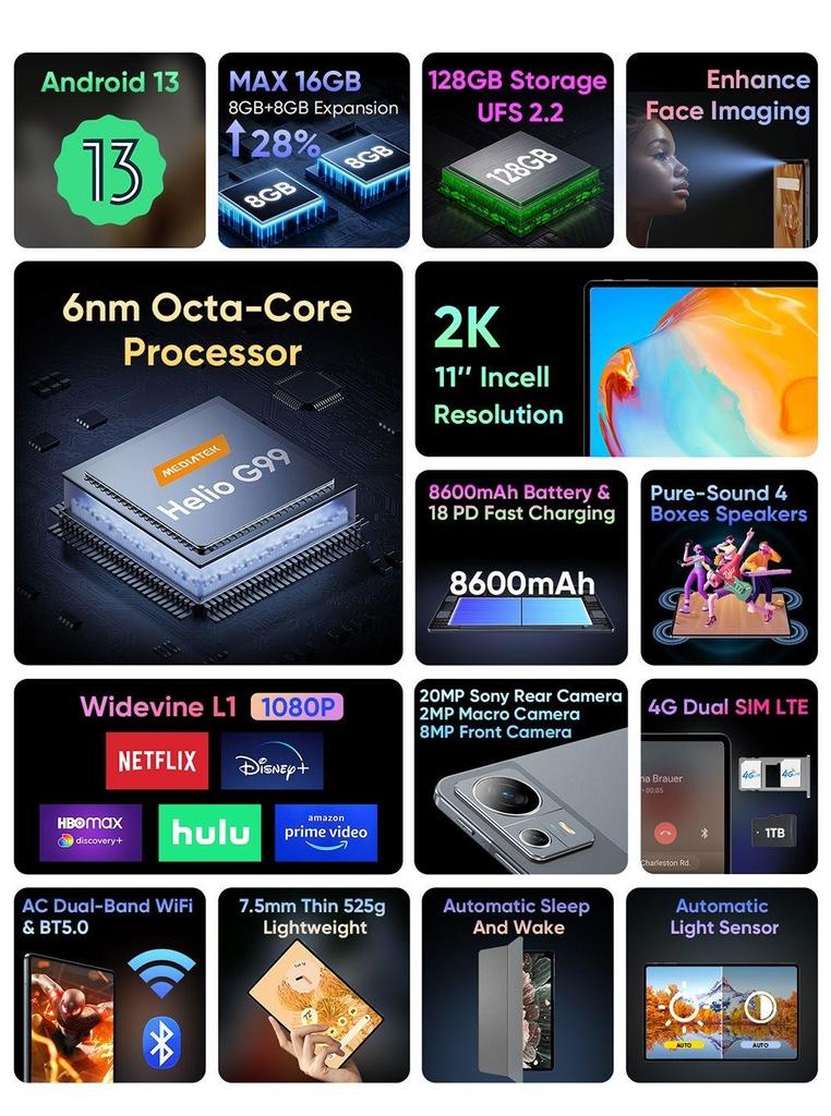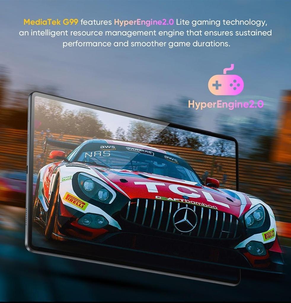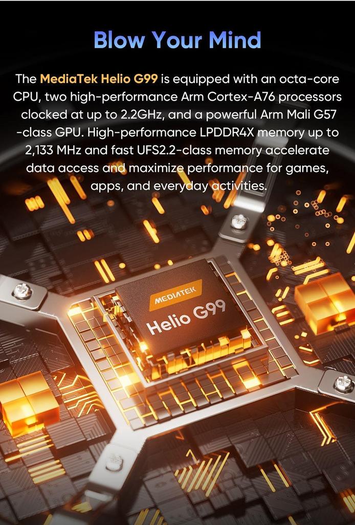 Оснащен 8-ядерным процессором MTK Helio G99, включающим два высокопроизводительных ядра Arm A76 и шесть наборов микросхем Arm A55, а также рабочую частоту до 2,2 ГГц, что обеспечивает гораздо более плавную работу при игре или многозадачности при работе.