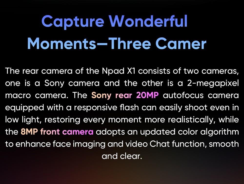 Задняя камера NPAD X состоит из двух камер: одна — камеры Sony, а другая — 2-мегапиксельной макрокамеры.. Задняя камера Sony с разрешением 20 МП и автофокусом оснащена отзывчивой вспышкой, что позволяет легко снимать даже при слабом освещении, а фронтальная камера 8 МП оснащена обновленным алгоритмом цветопередачи, обеспечивающим улучшенное изображение лица и плавные и четкие видеочаты.