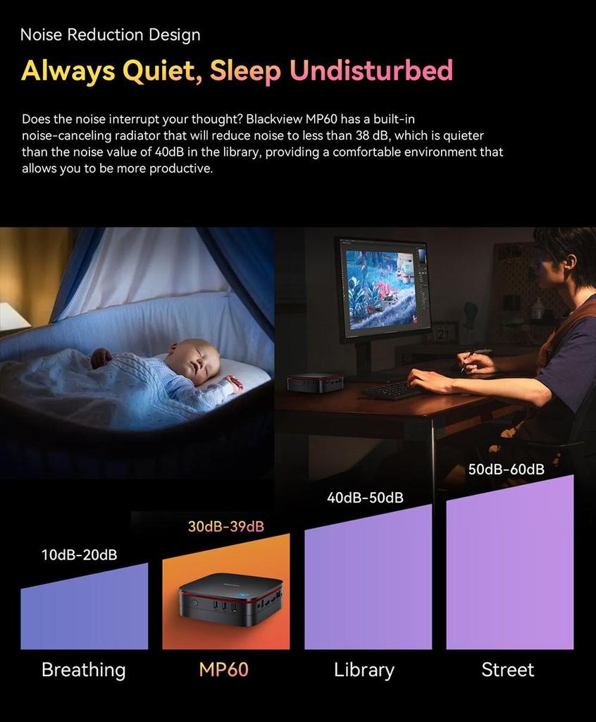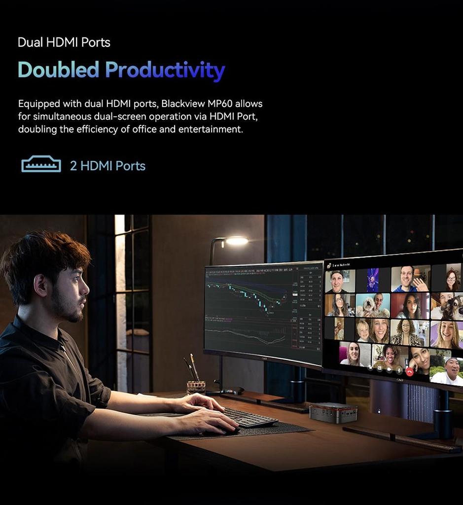 Мини-ПК Blackview MP60 имеет размеры всего 5 x 5 x 2,1 дюйма, что делает его идеальным для многолюдных рабочих мест или небольших помещений.. Поставляется с креплением VESA, которое легко крепится к задней части монитора, экономя место и обеспечивая чистоту рабочего стола.. Функция двойного дисплея 4K HDMI позволяет подключить два монитора и расширить рабочее пространство, упрощая многозадачность и идеально подходя для домашних развлечений, домашнего офиса или конференц-зала.