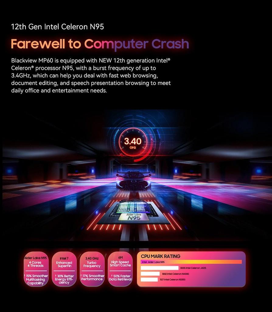 Мини-ПК Blackview MP60 оснащен более быстрым четырехъядерным процессором Intel Alder Lake N95 12-го поколения. (до 3,4 ГГц). Надежный мини-ПК Blackview MP60 справится с повседневными задачами, позволяя вам делать больше и быстрее.