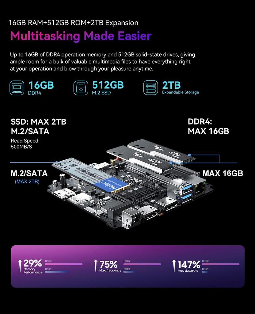 Настольный мини-ПК Blackview MP60 оснащен высокоскоростной оперативной памятью DDR4 объемом 16 ГБ и встроенным твердотельным накопителем M.2 2280 объемом 512 ГБ для быстрой загрузки и повышения общей производительности.. ПЗУ объемом 512 ГБ позволяет хранить большие объемы данных и файлов и может быть расширено до 2 ТБ.. Идеально подходит для бизнеса, образования и повседневного использования, а также для многозадачности, просмотра и обработки больших графических файлов.