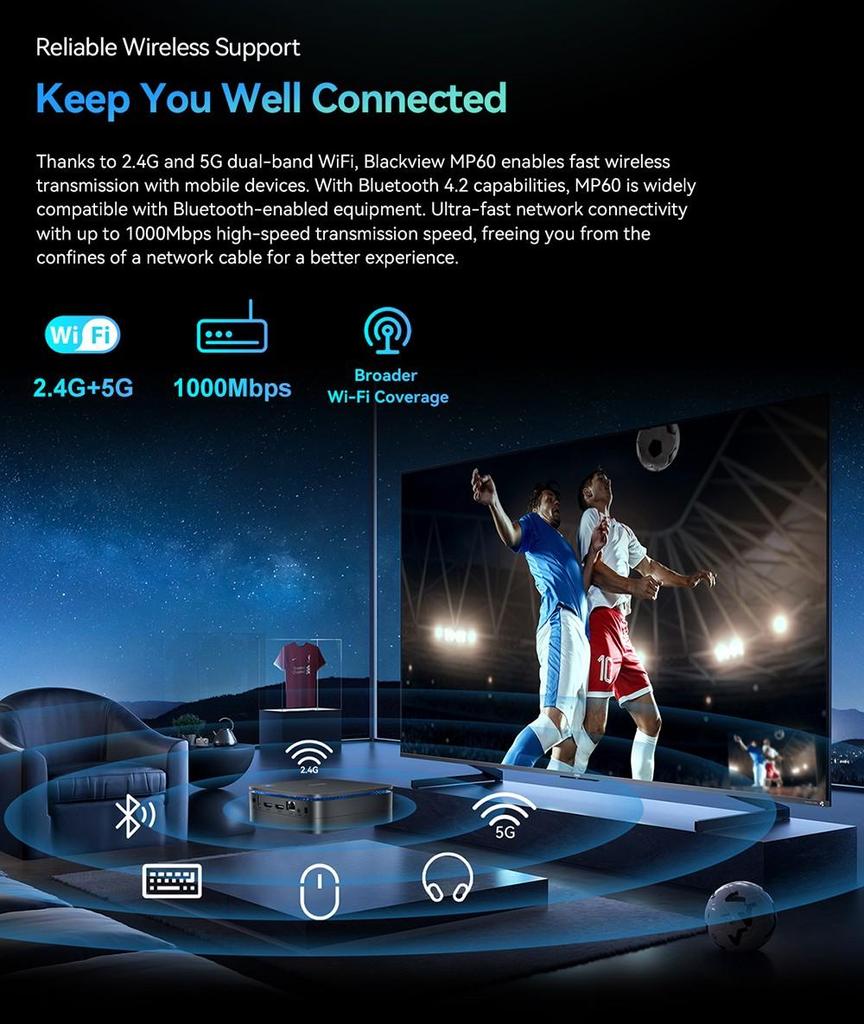 Мини-настольный компьютер Blackview MP60 с USB2.0 *2, USB3.0 *2, 4K HDMI*2, RJ45*1, гнездом постоянного тока*1, аудиоразъемом 3,5 мм* 1. Двухдиапазонный Wi-Fi 2,4/5 ГГц и Bluetooth 4.2 позволяют легко подключать к этому мини-ПК различные устройства, включая серверы, офисное оборудование, проекторы, телевизоры и многое другое.