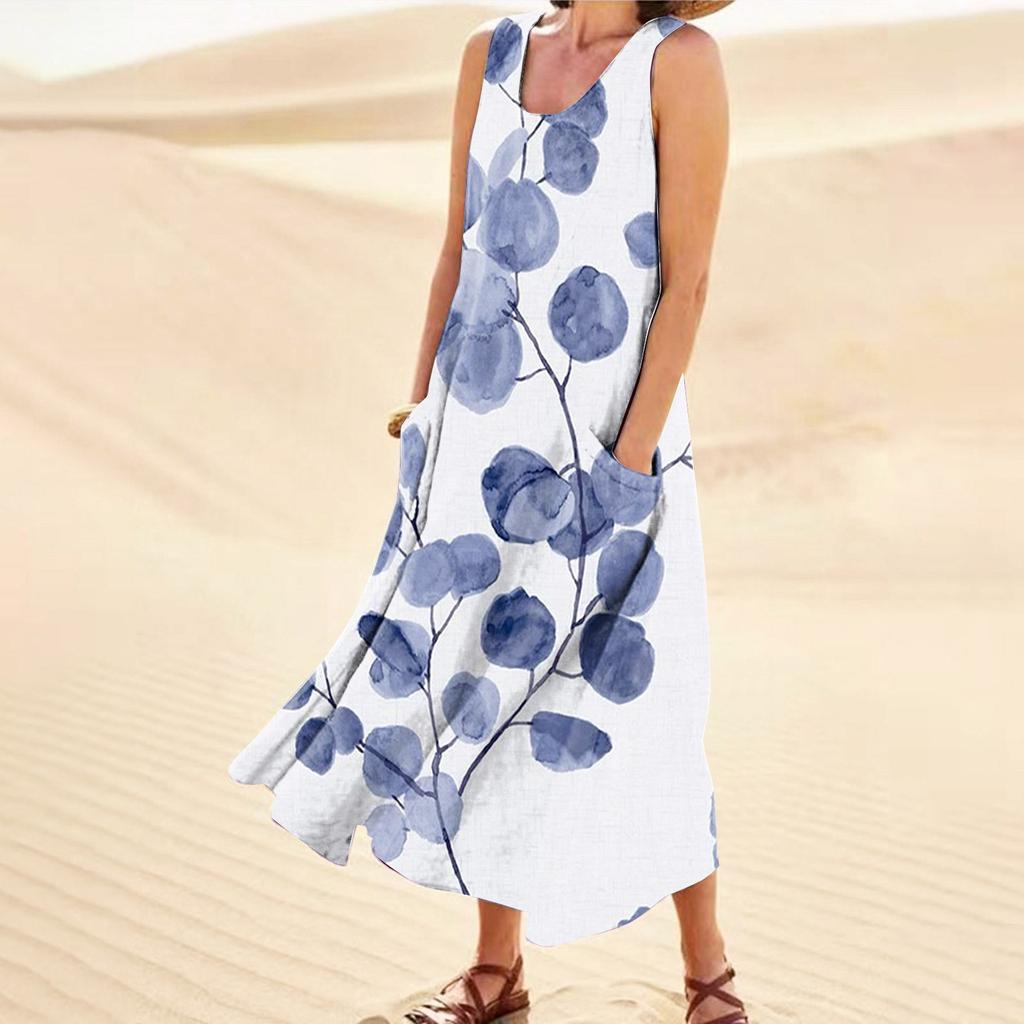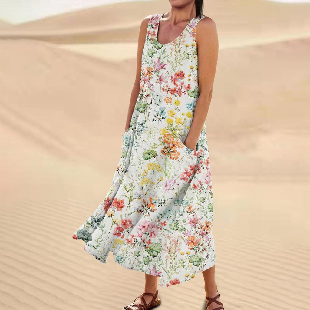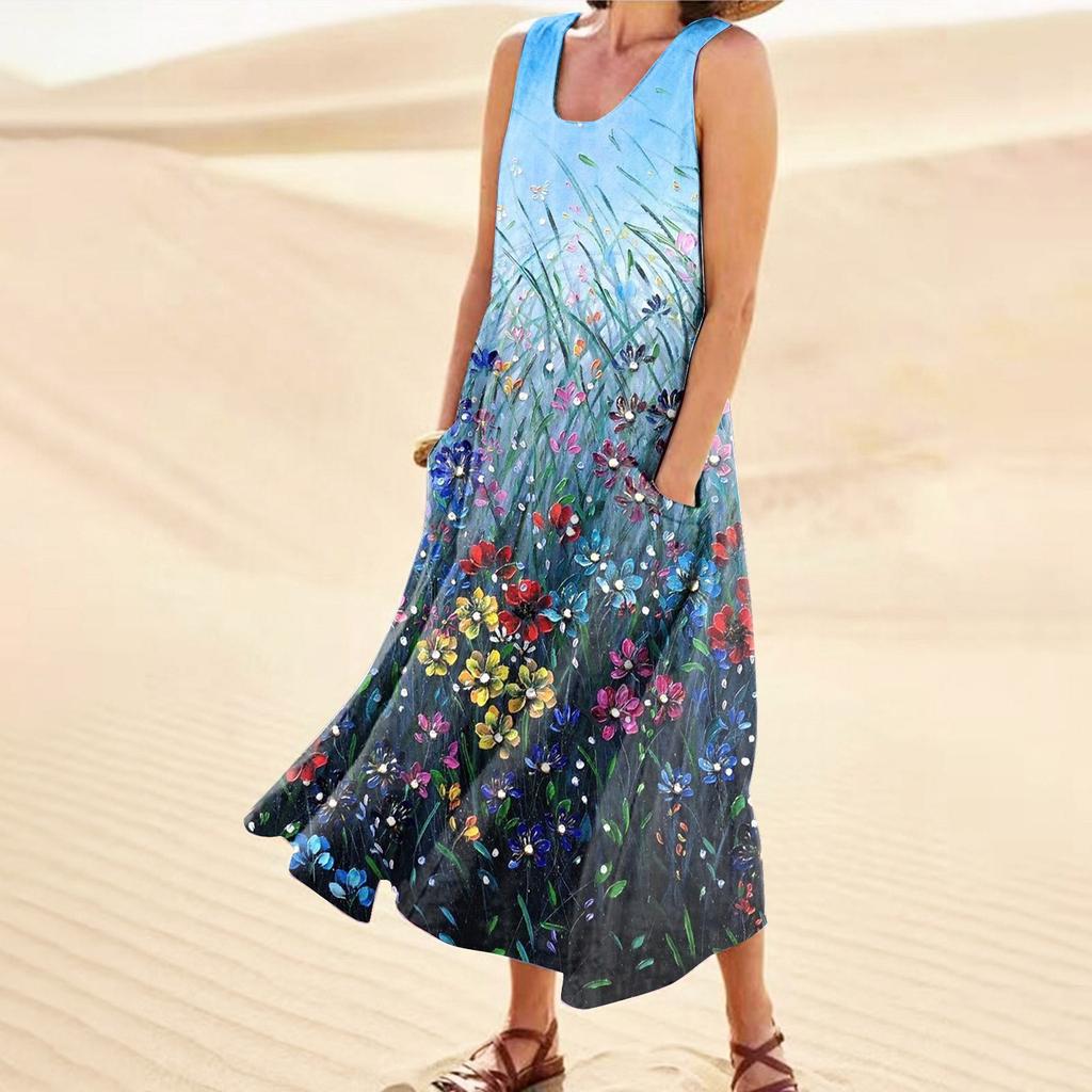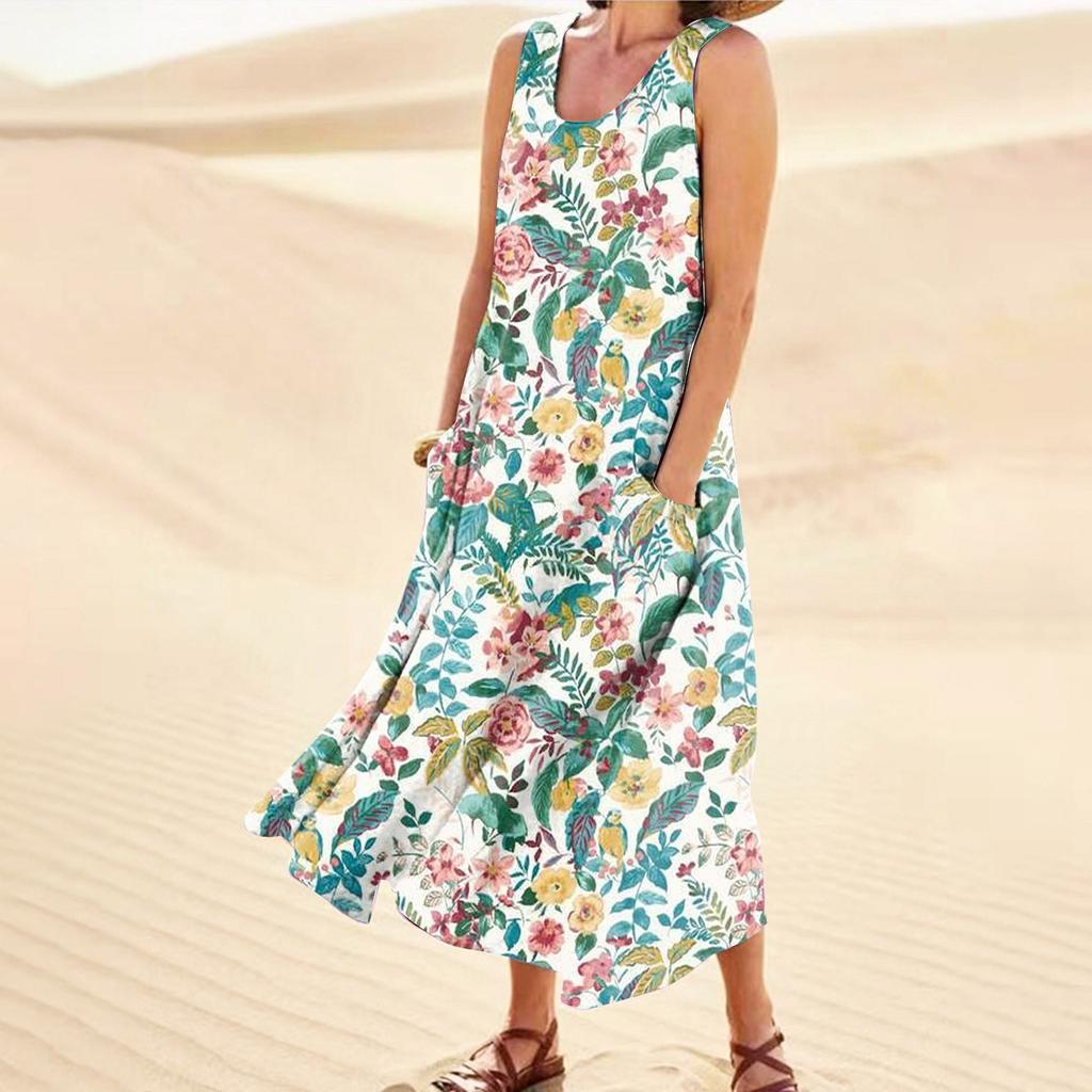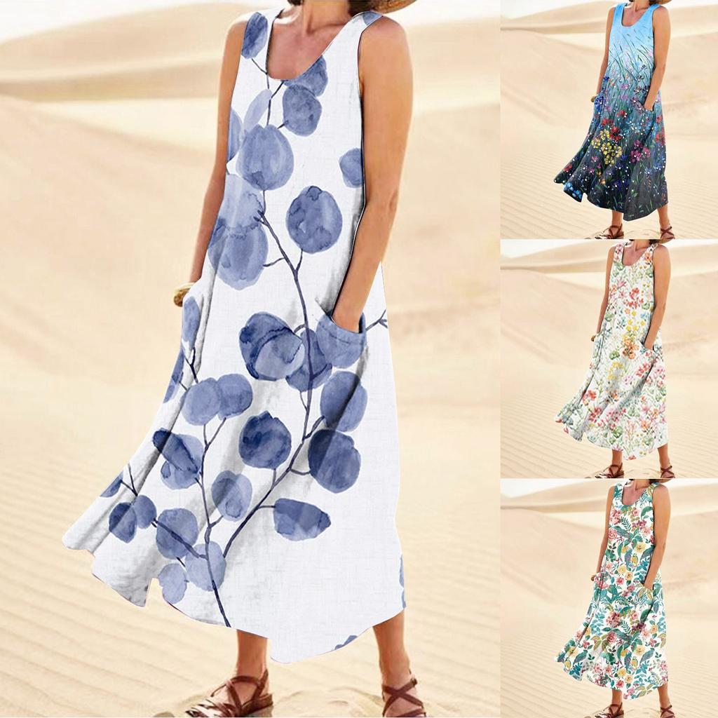 Модное летнее повседневное удобное хлопковое платье без рукавов с цветочным принтом и карманным пляжным платьем для женщин