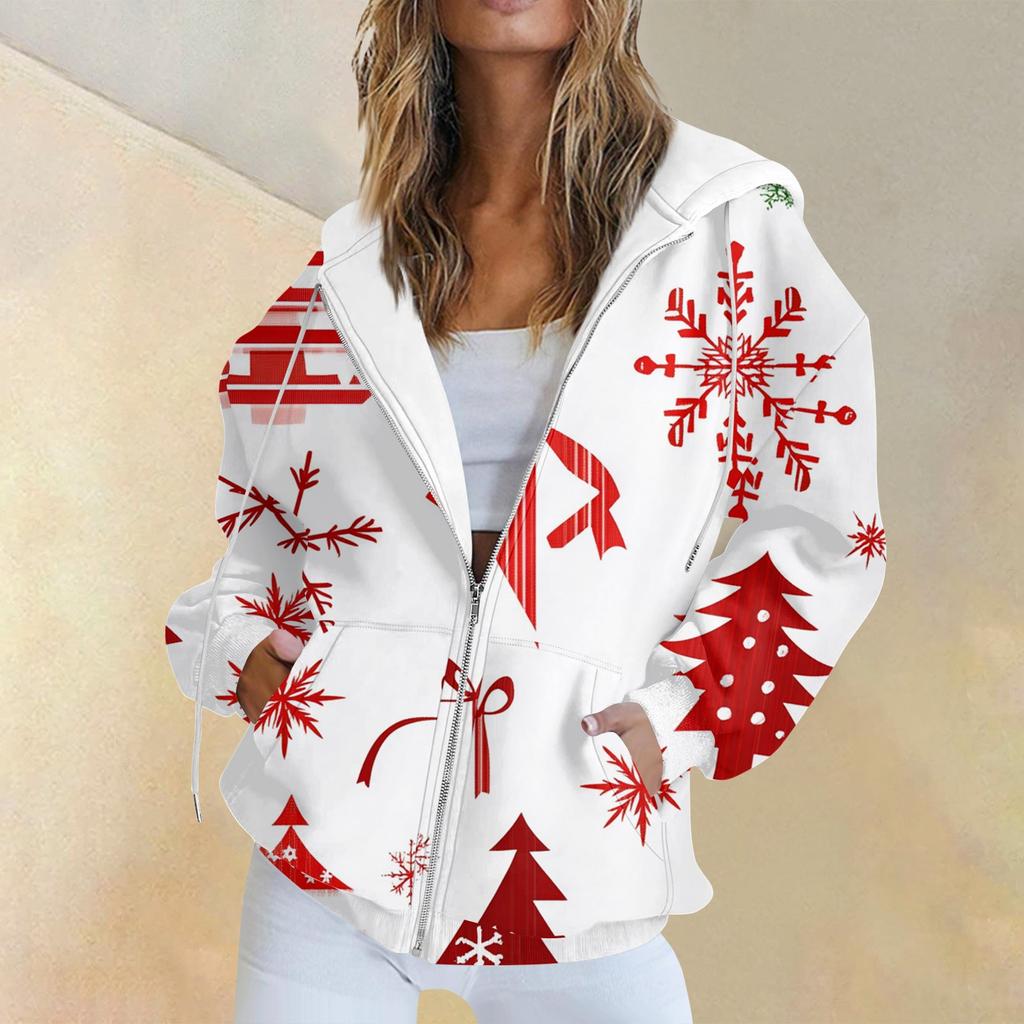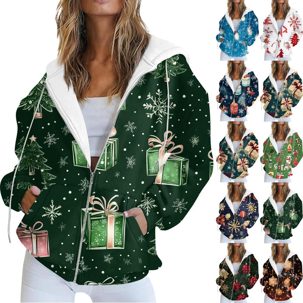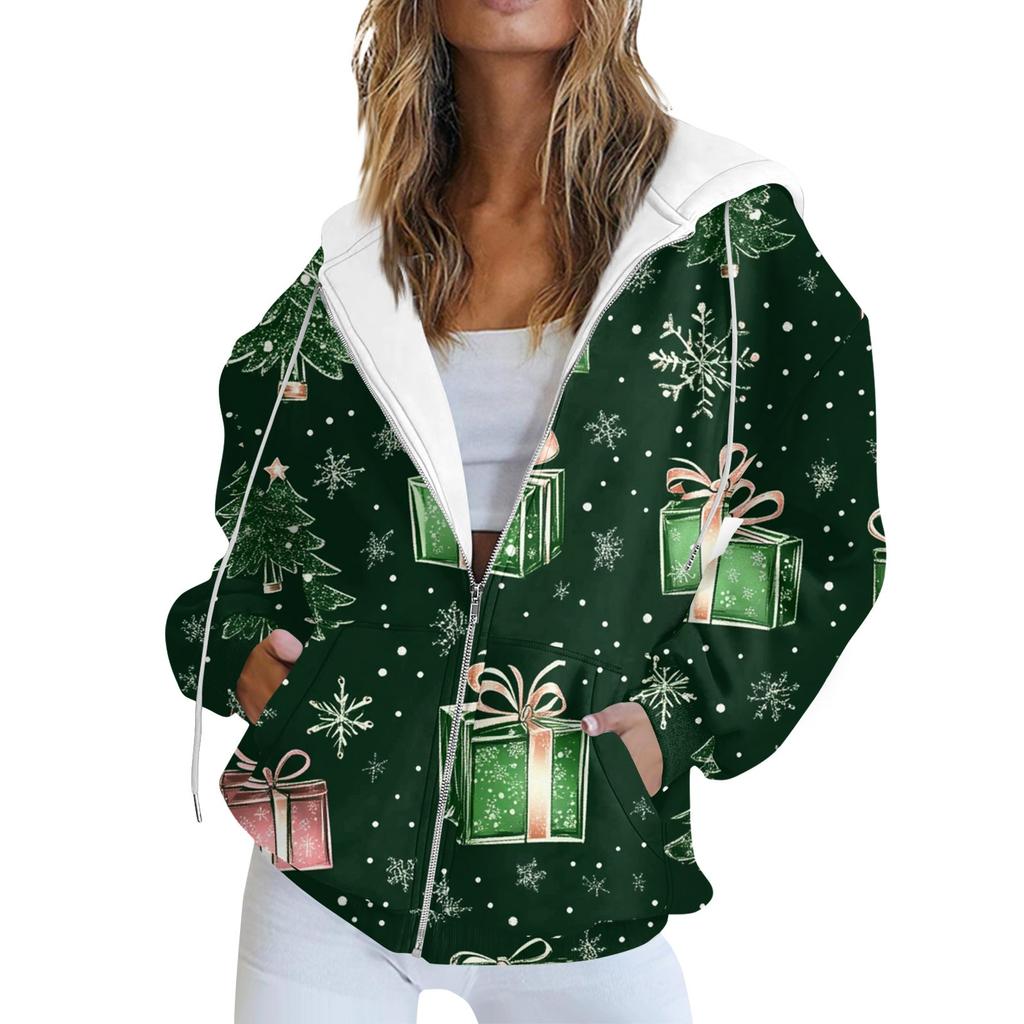 Женская повседневная рождественская печатная толстовка на осень и зиму с длинными рукавами и карманом на молнии с капюшоном