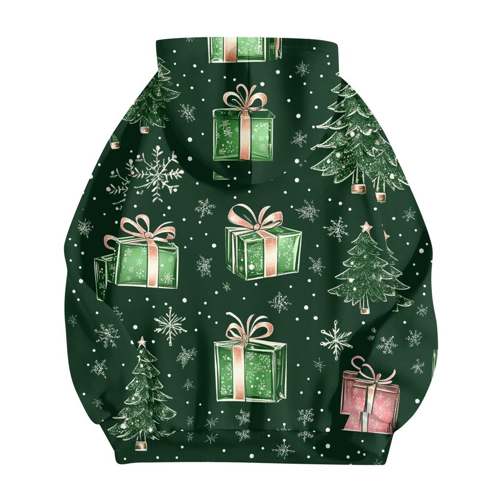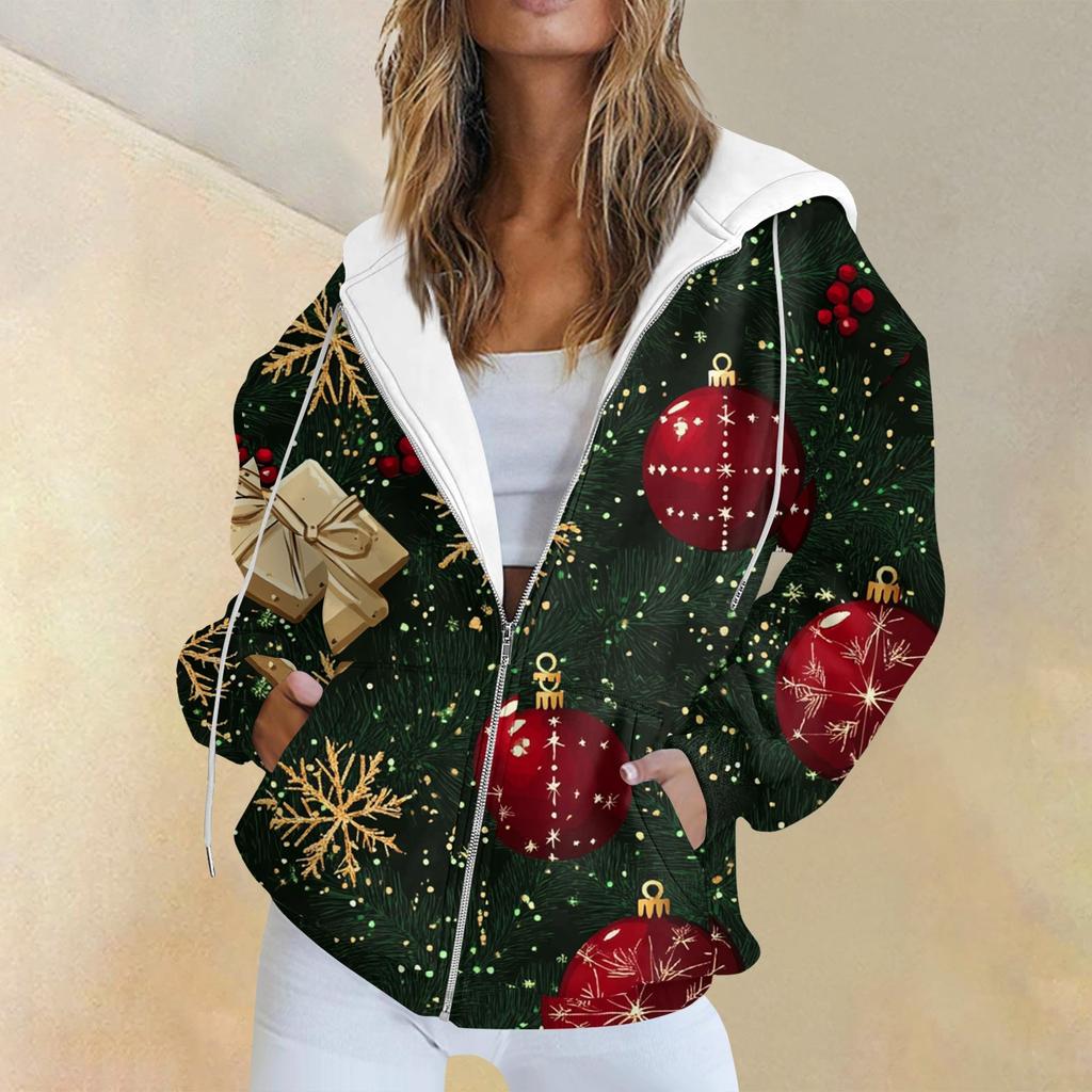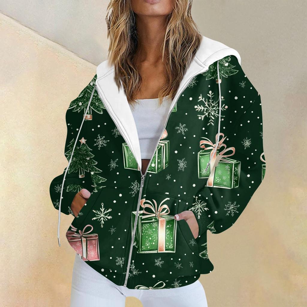 Женская повседневная рождественская печатная толстовка на осень и зиму с длинными рукавами и карманом на молнии с капюшоном