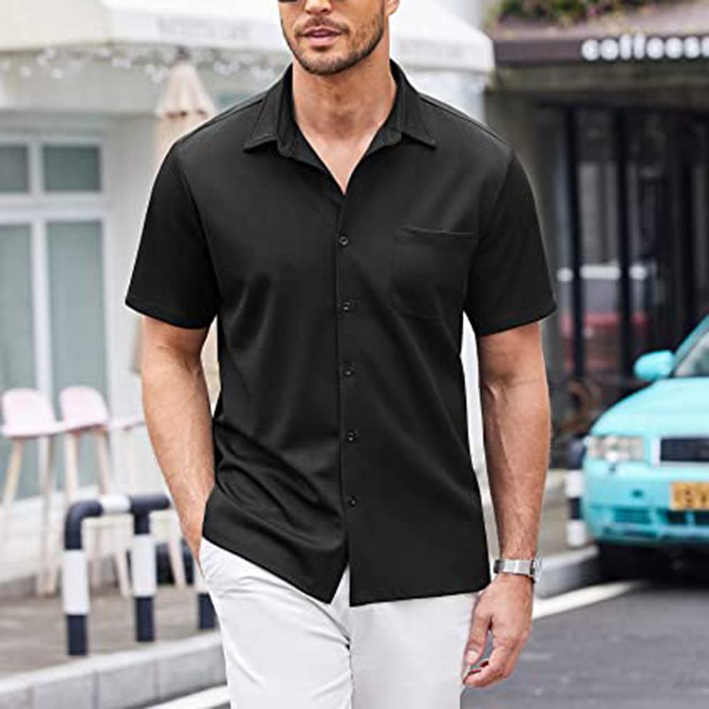 [ДИЗАЙН] Эта мужская повседневная рубашка отличается коротким рукавом, воротником, обычной посадкой, застежкой на пуговицы, сплошным цветом и накладным карманом на груди.