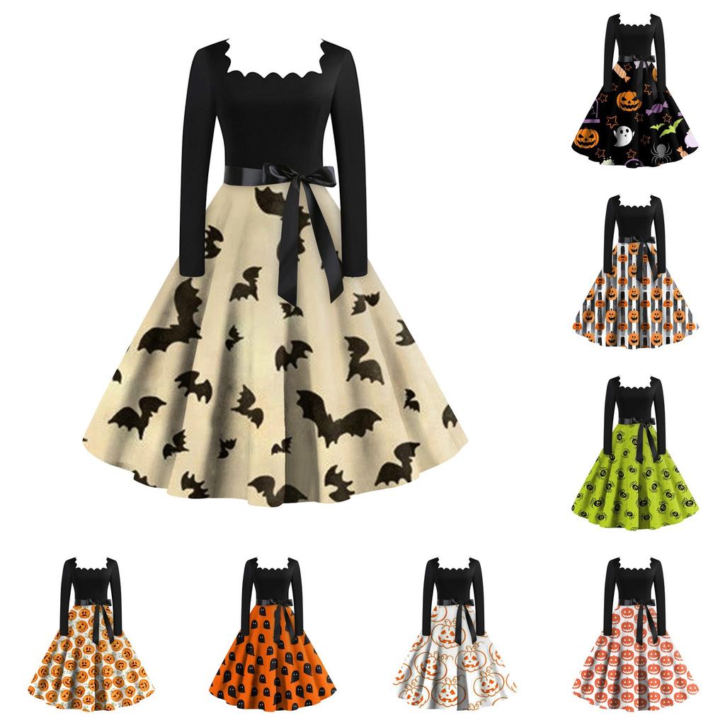 Женское повседневное модное винтажное платье с длинным рукавом и принтом на Хэллоуин — купить товар онлайн с бесплатной доставкой по всему миру!