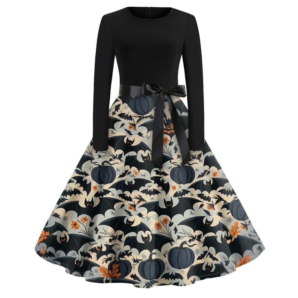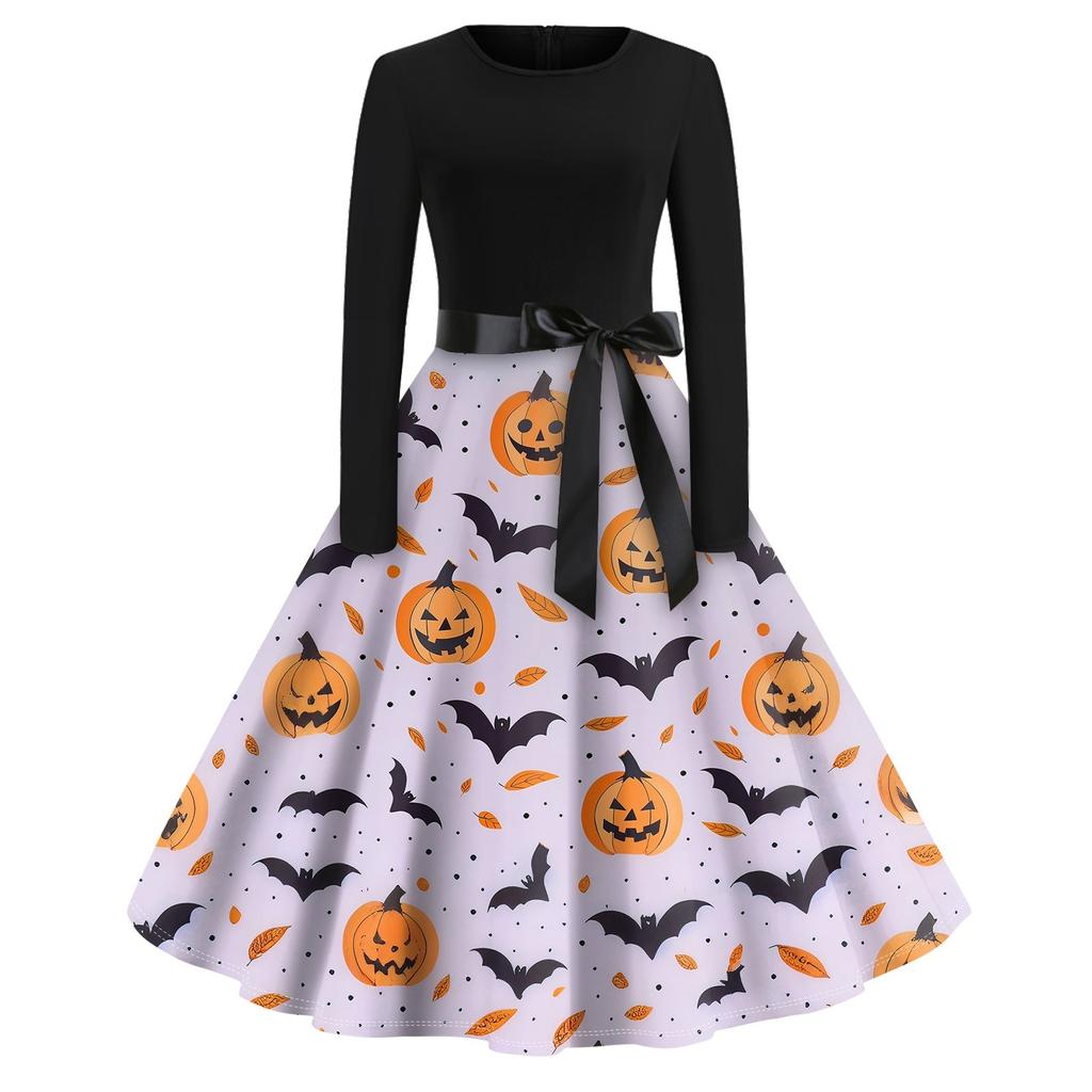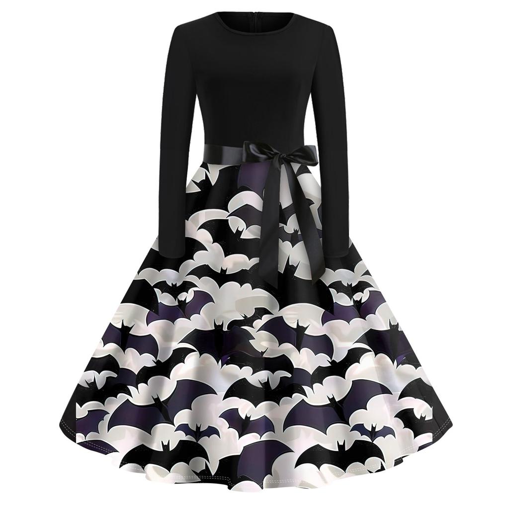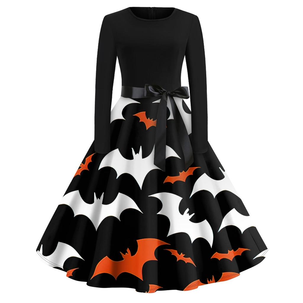 Платье-клеш с принтом на Хэллоуин для женщин с длинным рукавом, повседневные платья с круглым вырезом и ажурной отделкой