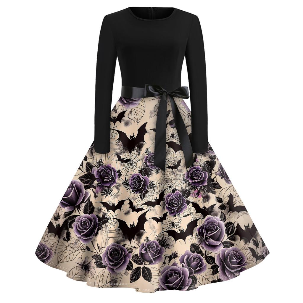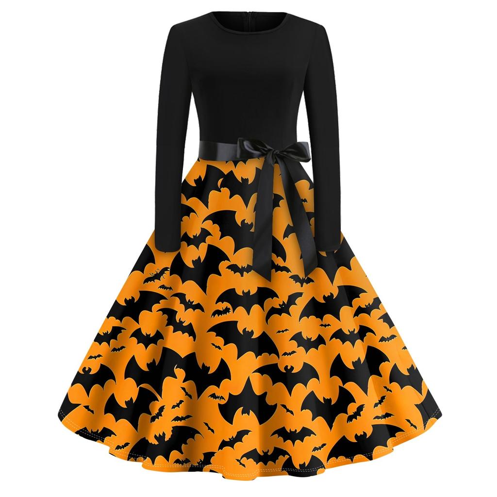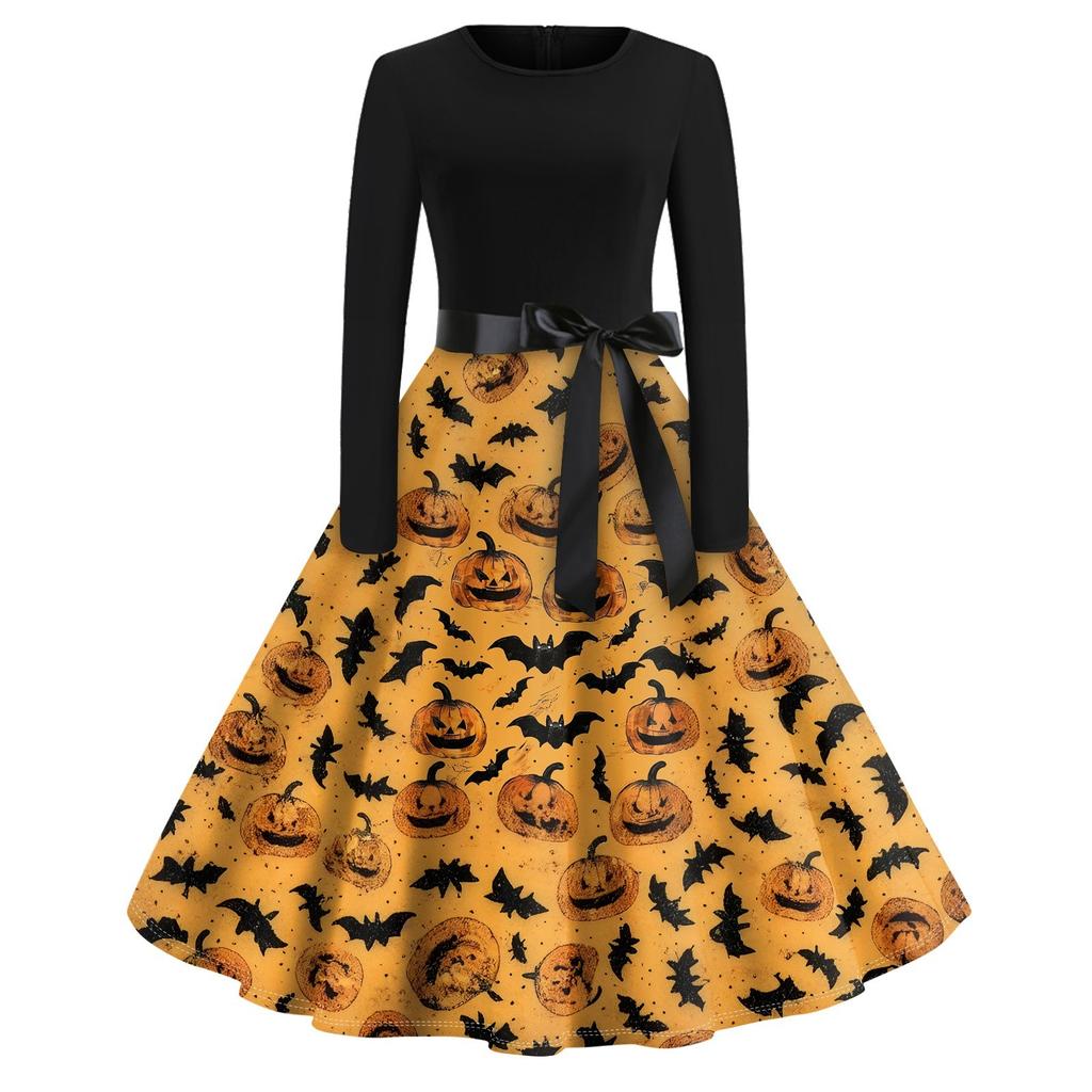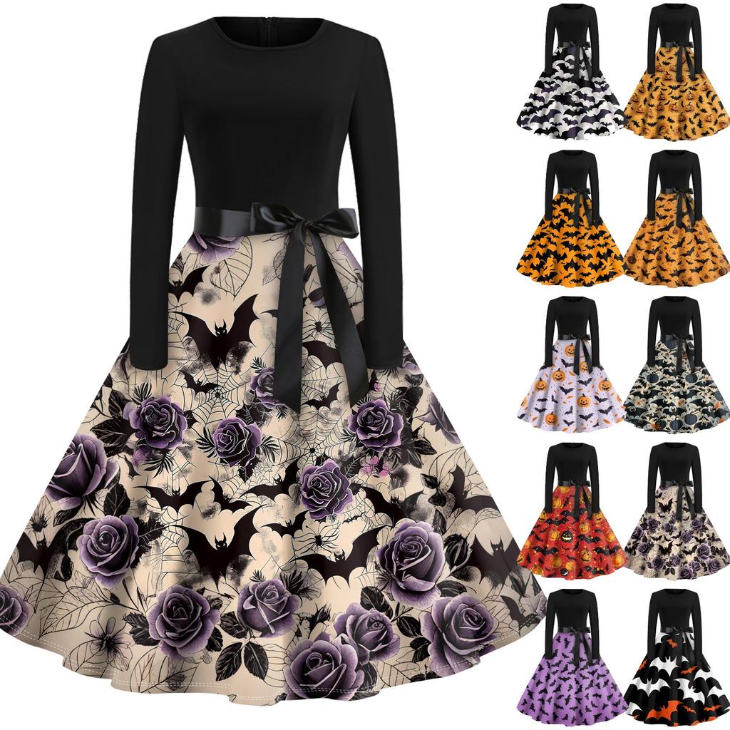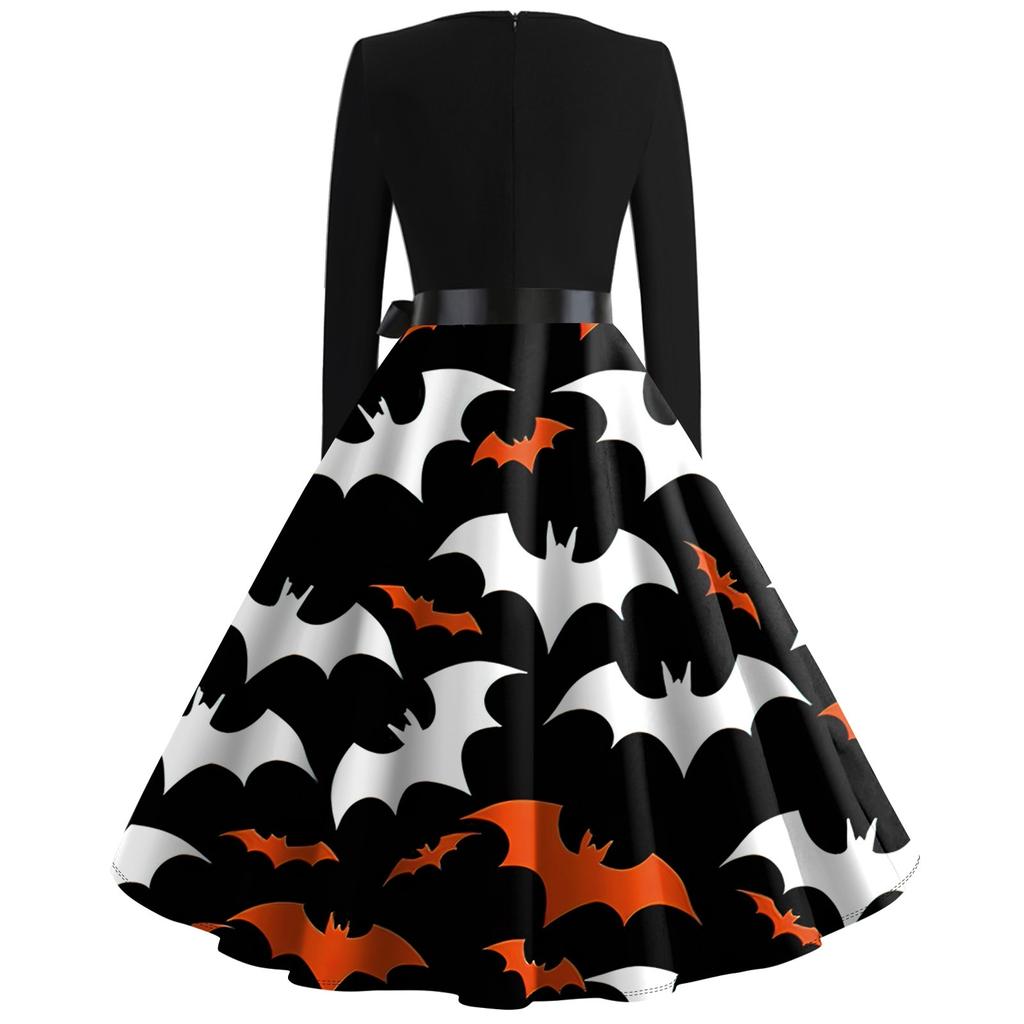 Платье-клеш с принтом на Хэллоуин для женщин с длинным рукавом, повседневные платья с круглым вырезом и ажурной отделкой