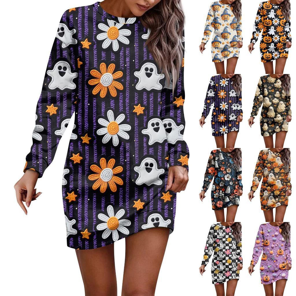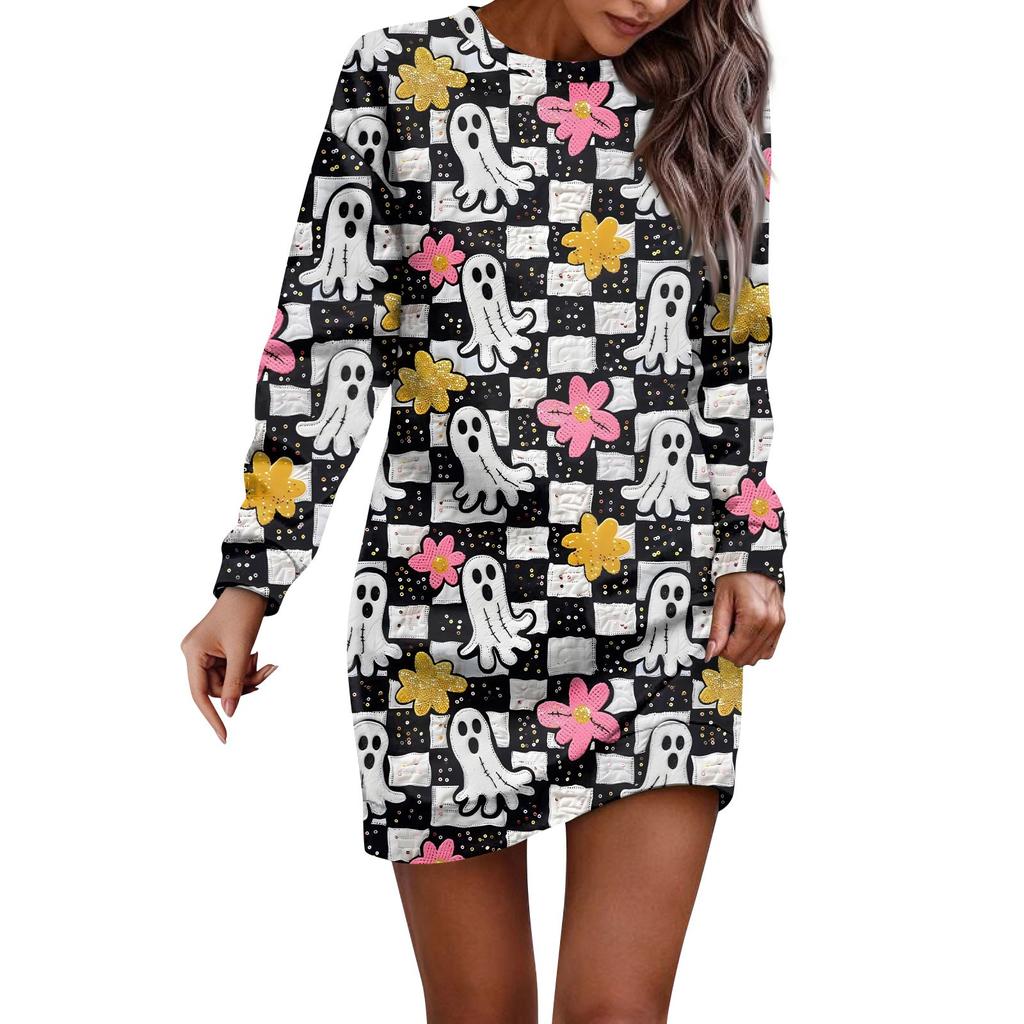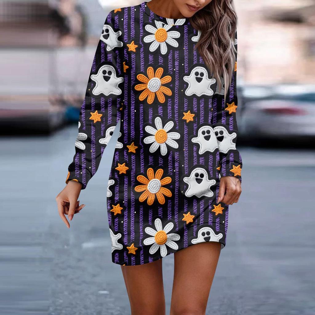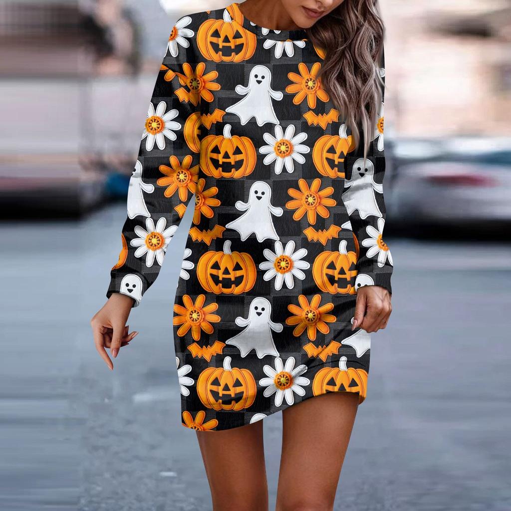 Женское платье с круглым вырезом и принтом на Хэллоуин с длинными рукавами и бедрами, платья-толстовки