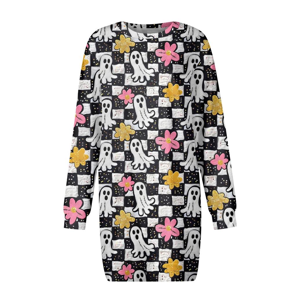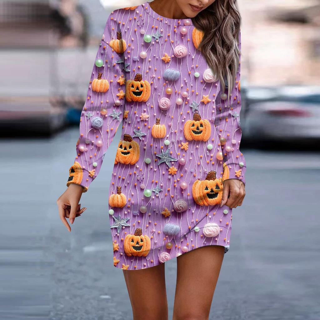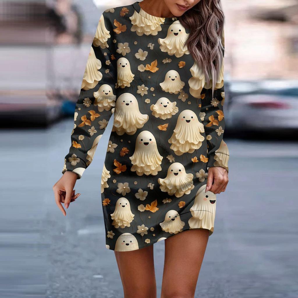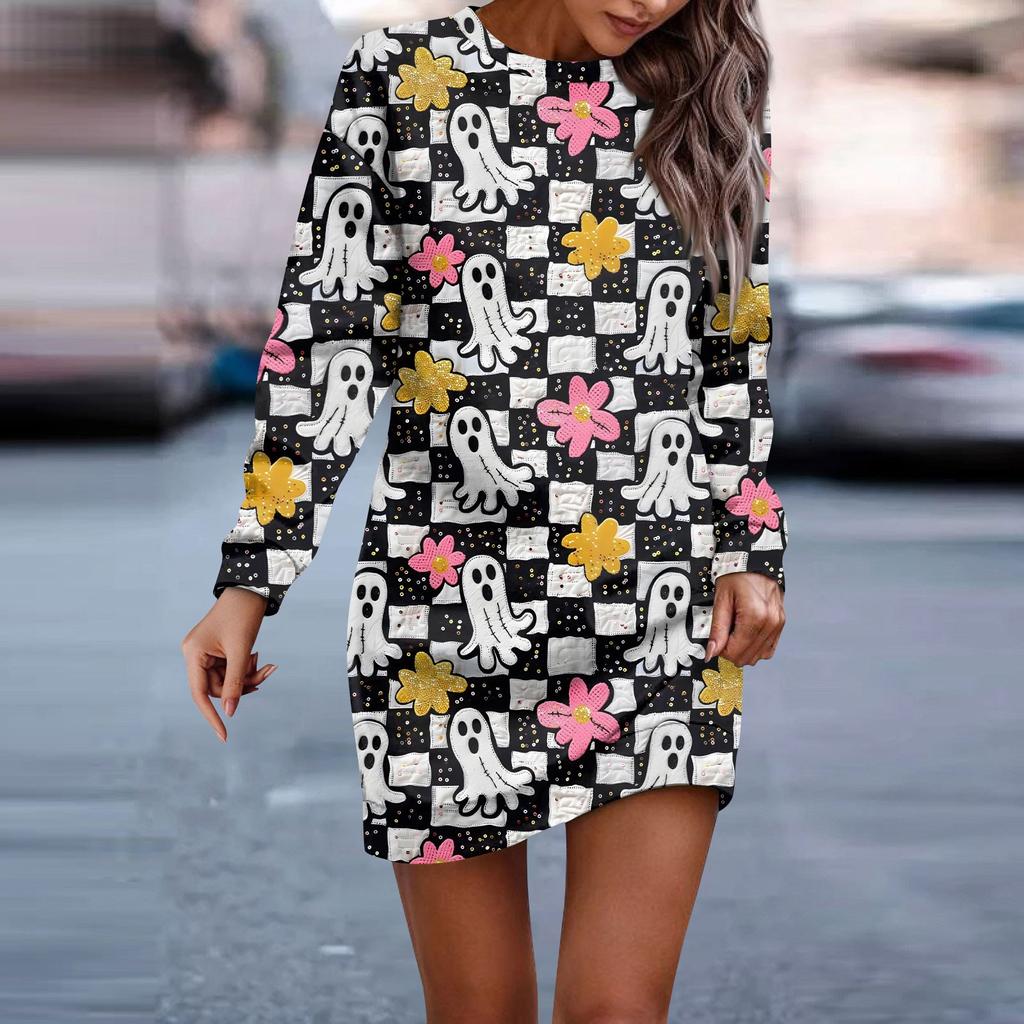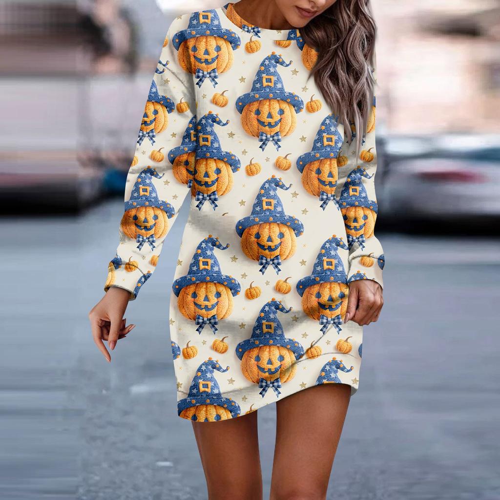 Женское платье с круглым вырезом и принтом на Хэллоуин с длинными рукавами и бедрами, платья-толстовки