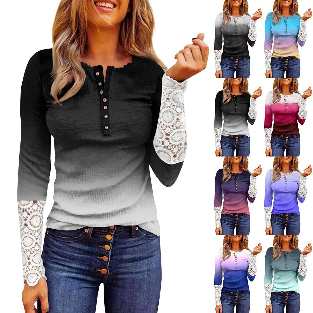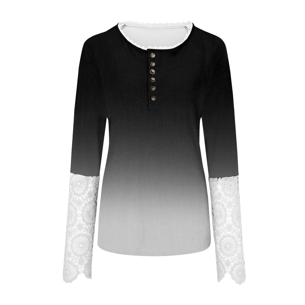 Женский осенний тонкий вырез с круглым вырезом и пуговицами, тонкий кружевной топ с длинными рукавами и принтом с постепенным изменением