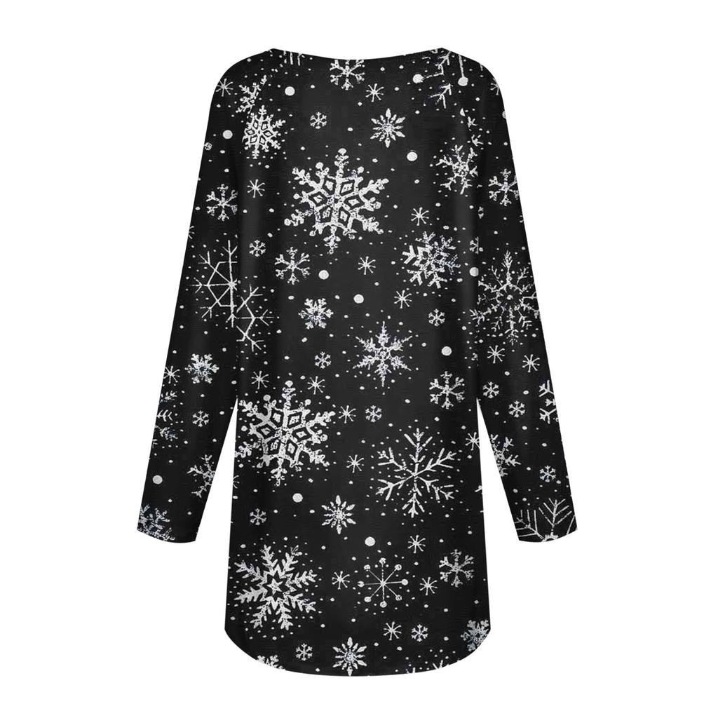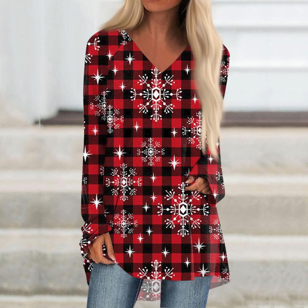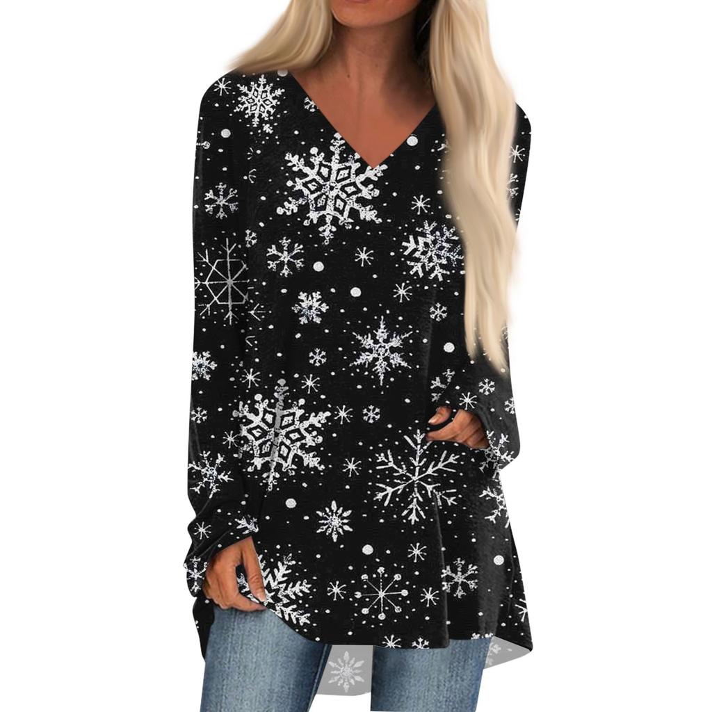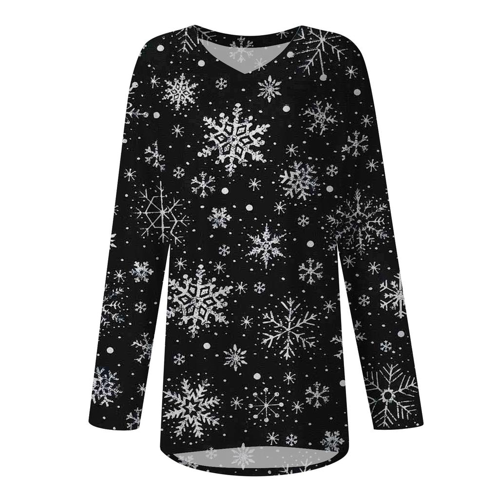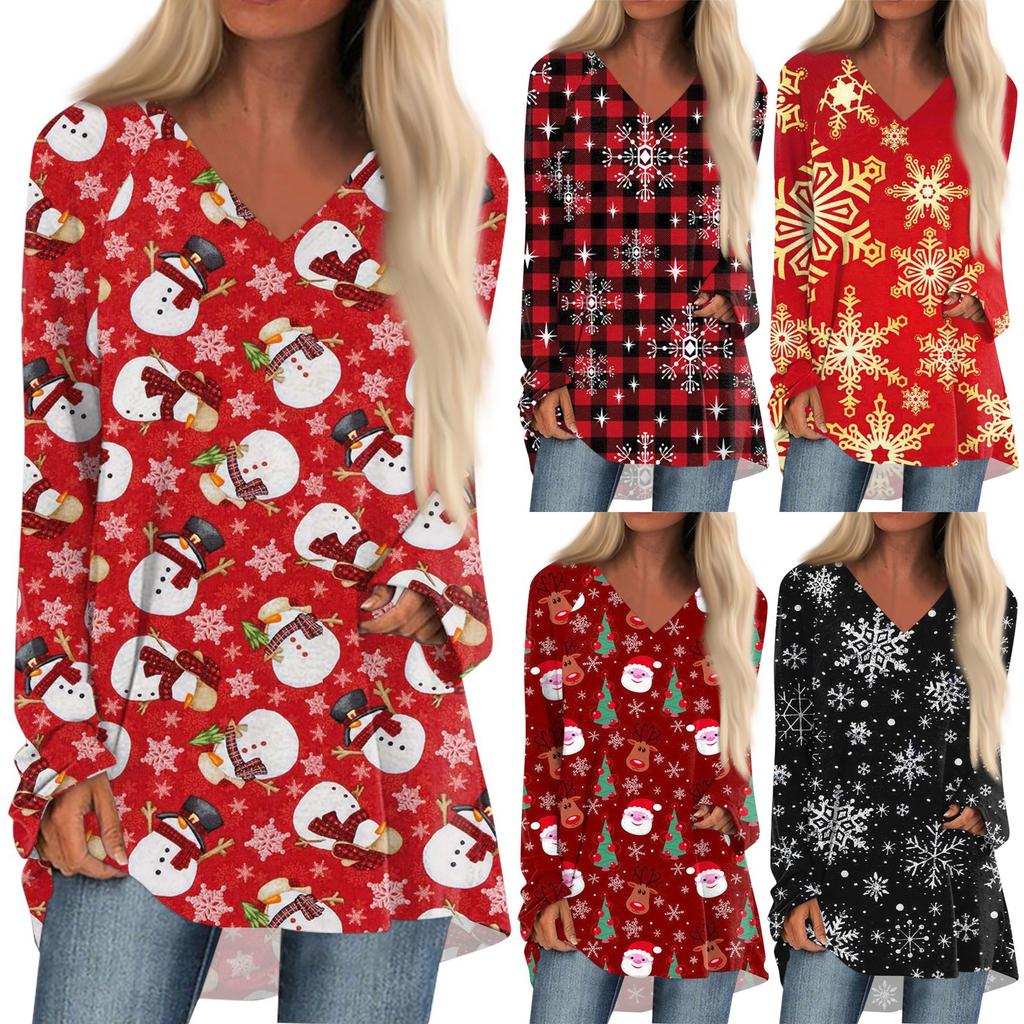Женская осенне-зимняя повседневная длинная свободная футболка с v-образным вырезом и рождественским принтом, топ