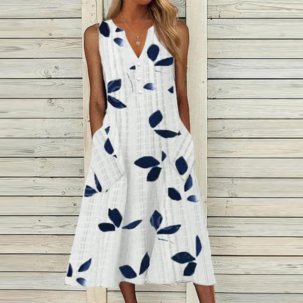 Платье-майка для женщин, повседневное летнее платье на пуговицах с v-образным вырезом и принтом листьев, свободное свободное платье-миди без рукавов с карманами