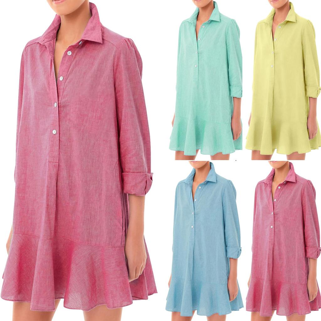Женская мода, повседневная полуоткрытая рубашка, классические однотонные платья на пуговицах с подолом и рюшами