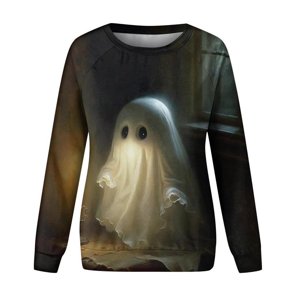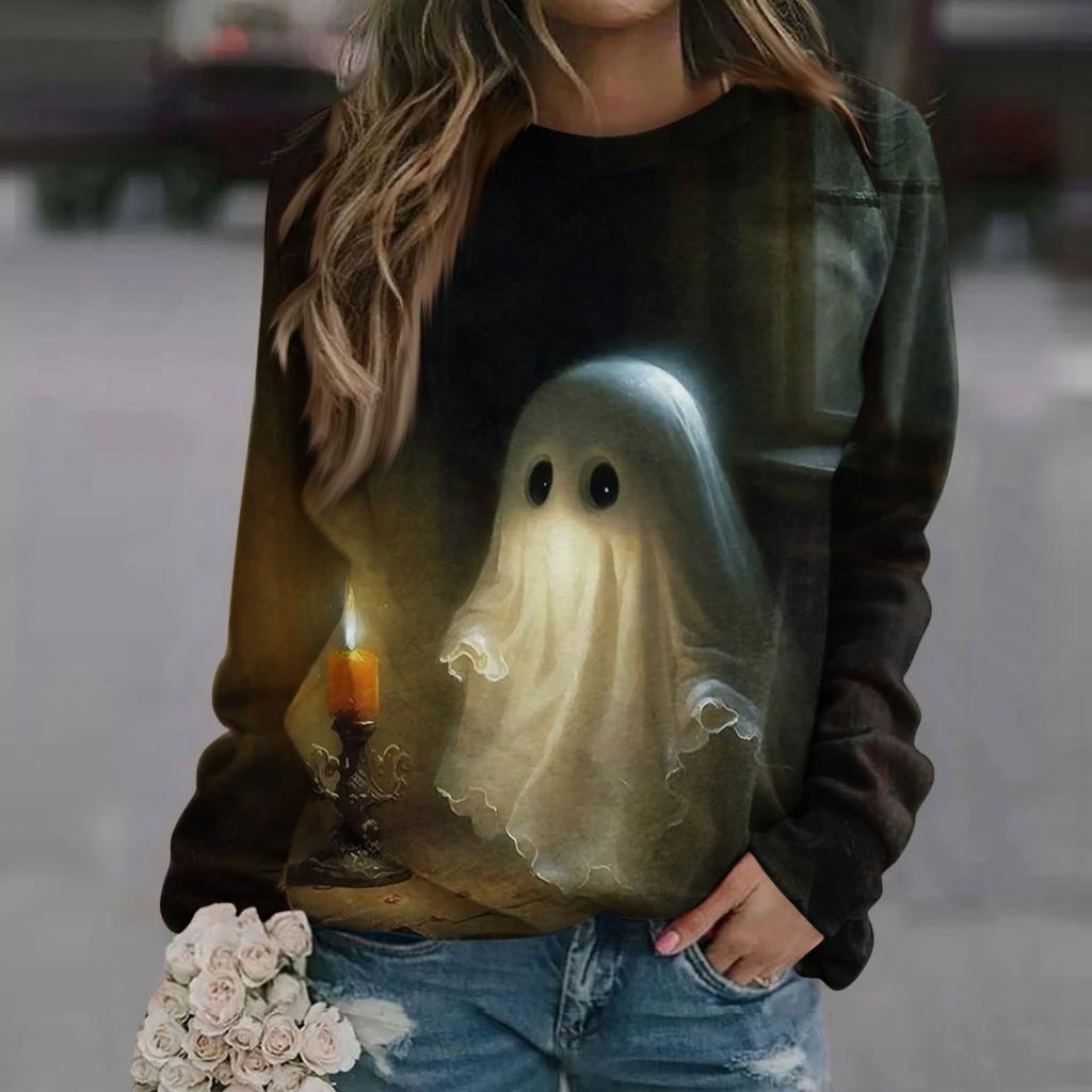 Женская модная повседневная винтажная футболка с принтом Хэллоуина и круглым вырезом, декоративная футболка с длинными рукавами, топ