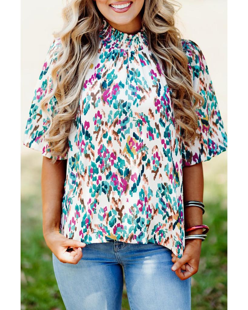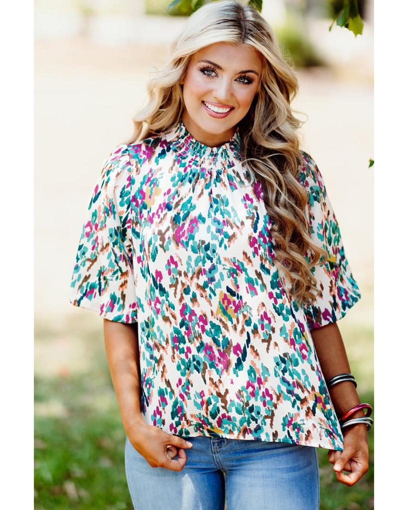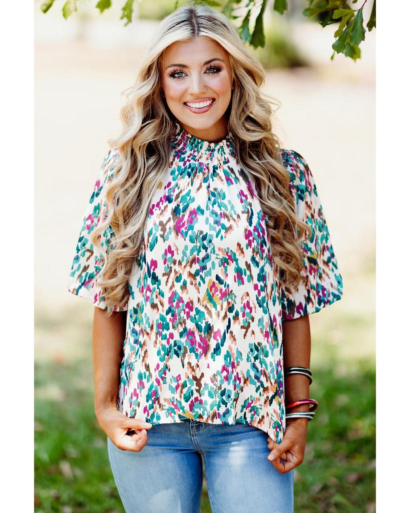 Azura Exchange Блузка светло-голубого цвета с абстрактным принтом и рукавами-фонариками с воротником-стойкой