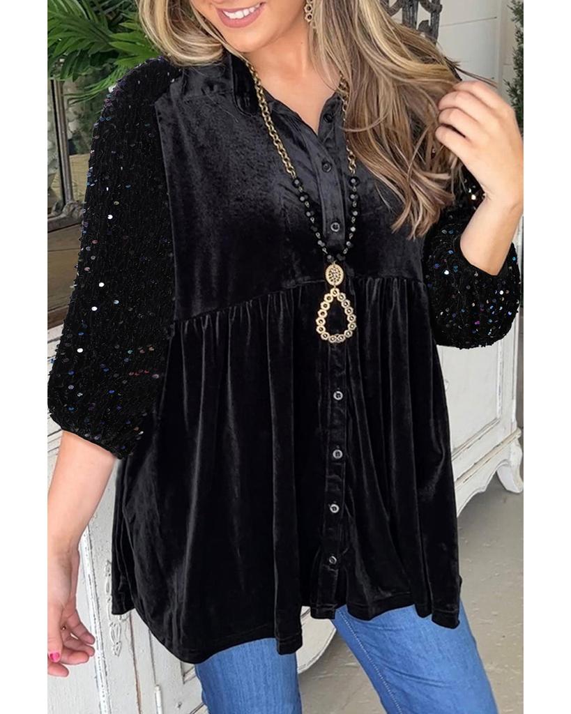 Azura Exchange Черная бархатная рубашка с баской и рукавами-фонариками, расшитыми пайетками — купить товар онлайн с бесплатной доставкой до всему миру!