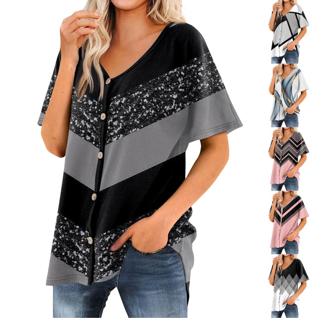 Женская футболка Футболка с принтом Женские рубашки V-образный вырез с короткими рукавами Туника на пуговицах Топы Блузка