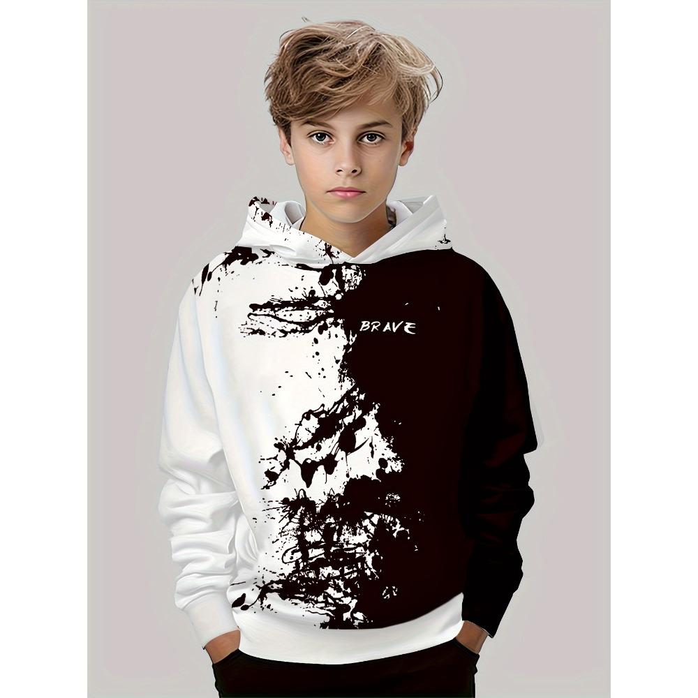 Модный черно-белый принт с буквами, универсальный, с длинными рукавами и капюшоном для мальчиков, детский топ с капюшоном, подходящий для повседневной одежды на открытом воздухе