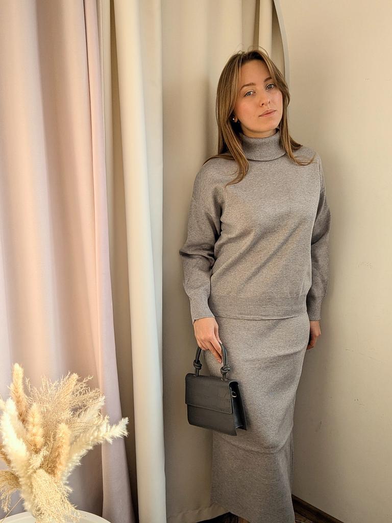 Осень-зима Ленивый ветер Свободный свитер с высоким воротом Костюм женский однотонный длинный рукав трикотажная юбка средней длины комплект из двух предметов