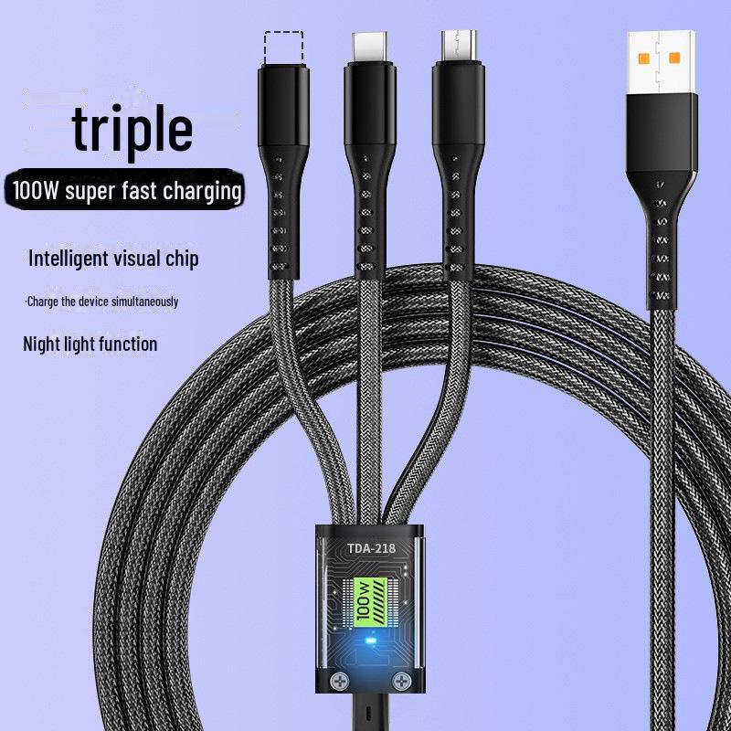 Кабель для зарядки мобильного телефона 3-в-1 с функцией быстрой зарядки мощностью 100 Вт, визуальным чипом, разъемом Type-C и световым индикатором.
