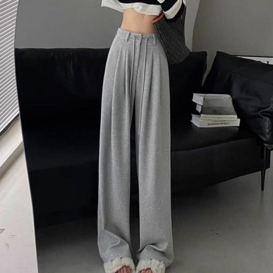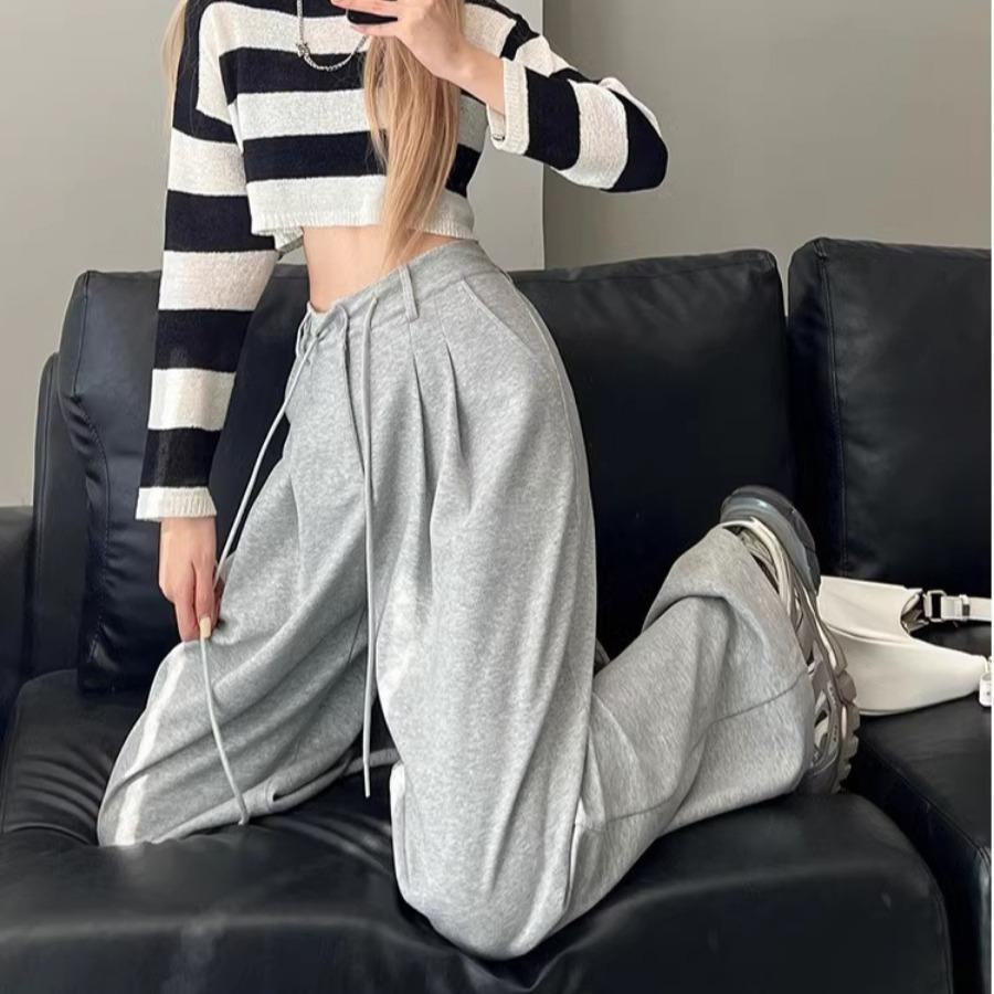 Серые черные широкие спортивные брюки для женщин с высокой талией, повседневные спортивные брюки с карманами и шнурком