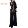 Подчеркните свой стиль с помощью этого изысканного женского костюма.. Широкие брюки визуально удлиняют ноги, а аккуратные швы на талии и бедрах создают привлекательный силуэт.. Пиджак имеет классический лацкан, застежку на одну пуговицу и полосатую строчку, придающую ему элегантность..